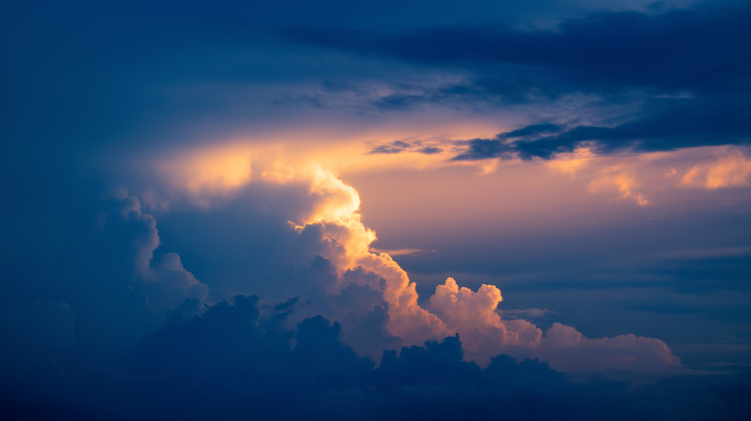Dramatic sky with cumulus clouds illuminated by sunset, featuring deep blues and vibrant oranges in a serene, powerful scene.