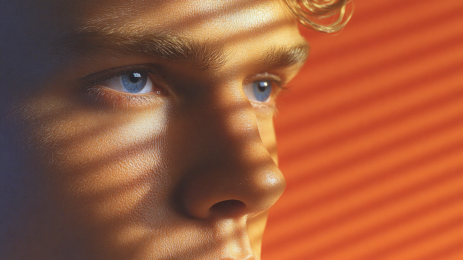 Close-up of a face with blue eyes and shadow patterns, set against an orange background with horizontal lines.