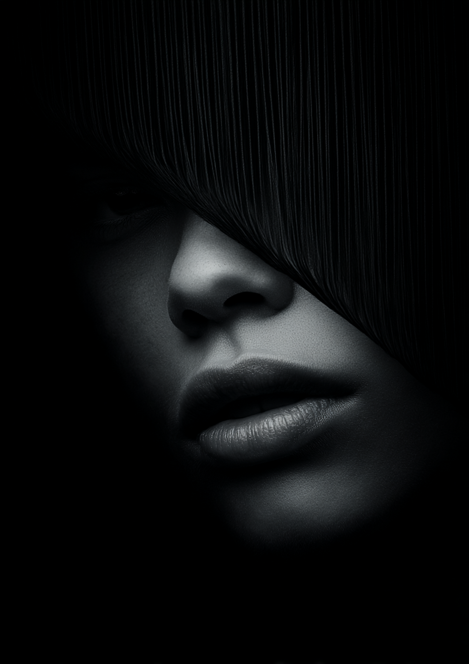 Dramatic close-up of a face in shadow, with textured skin and lips highlighted, creating a mysterious and artistic vibe.
