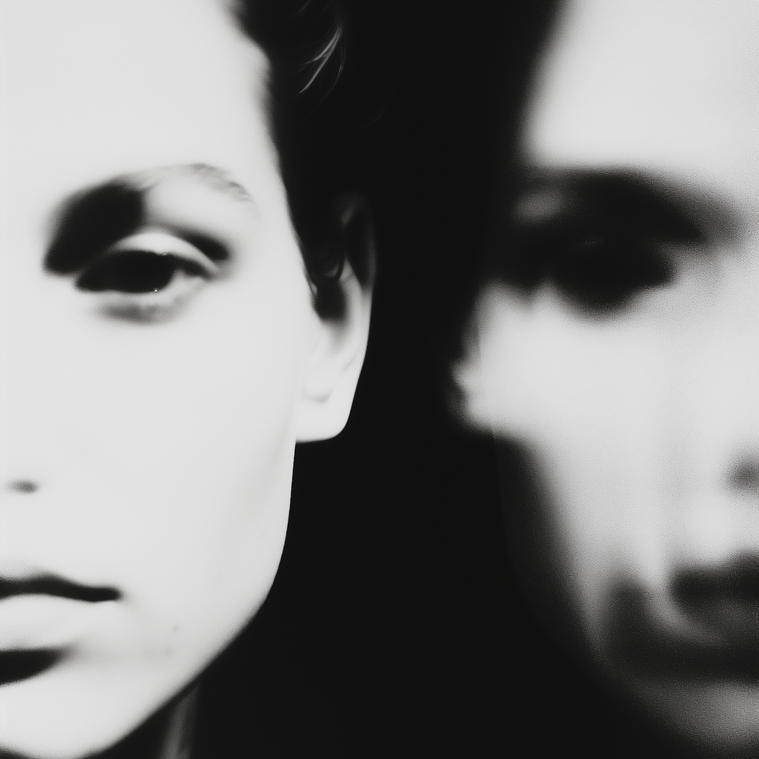 High-contrast black-and-white close-up of a face with a blurred double-exposure effect, creating a mysterious and dramatic vibe.