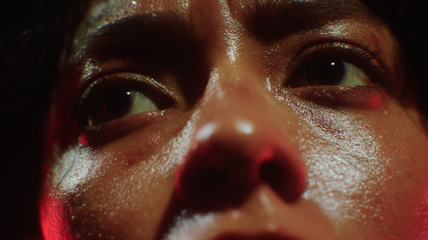 Close-up of a person's face with dramatic lighting, focusing on expressive eyes and detailed skin texture, creating an intense atmosphere.