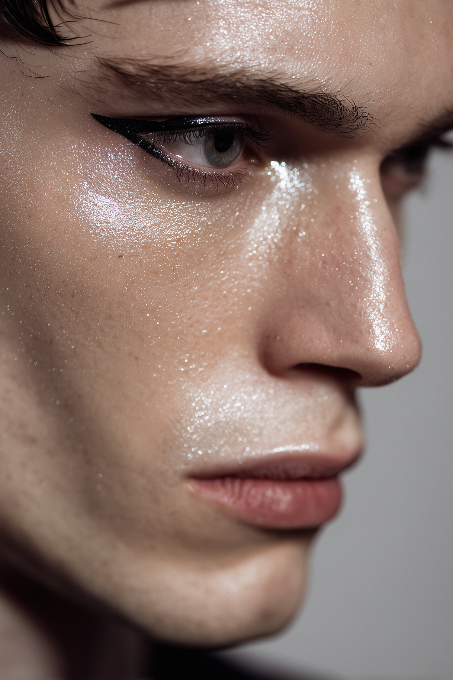 Close-up of a face with bold eyeliner and glossy skin, highlighting artistic makeup and natural features in soft lighting.