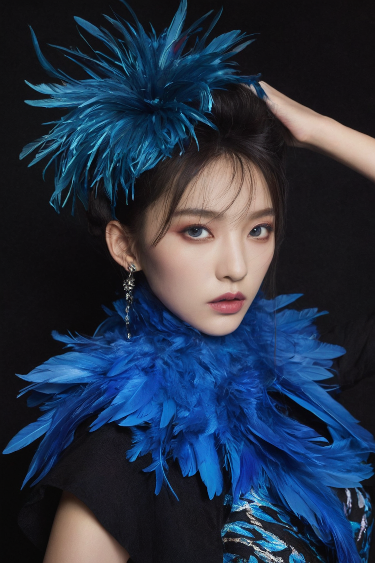 Fashion portrait of a woman styled with vibrant blue feather accessories, intricate earrings, and striking makeup during a photoshoot.