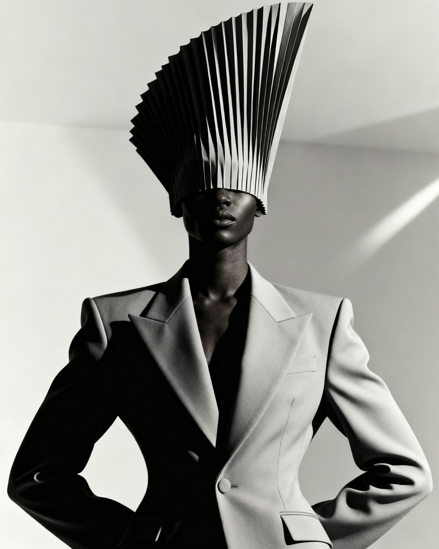 A bold black-and-white fashion portrait featuring a structured blazer and a pleated fan-like headpiece, emphasizing dramatic lighting.