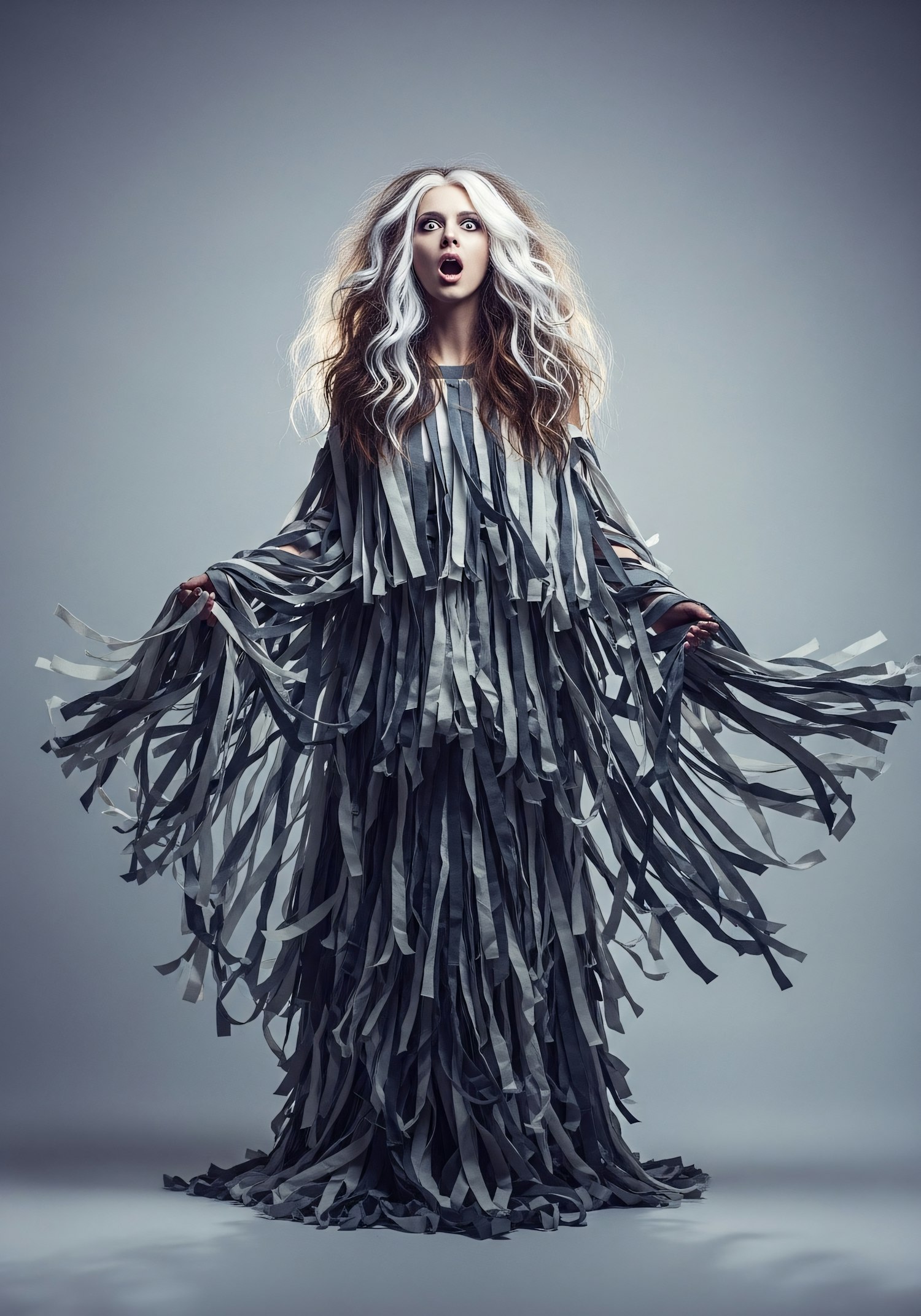 A person in a flowing gray outfit with voluminous hair poses dramatically against a neutral background, creating a striking visual.