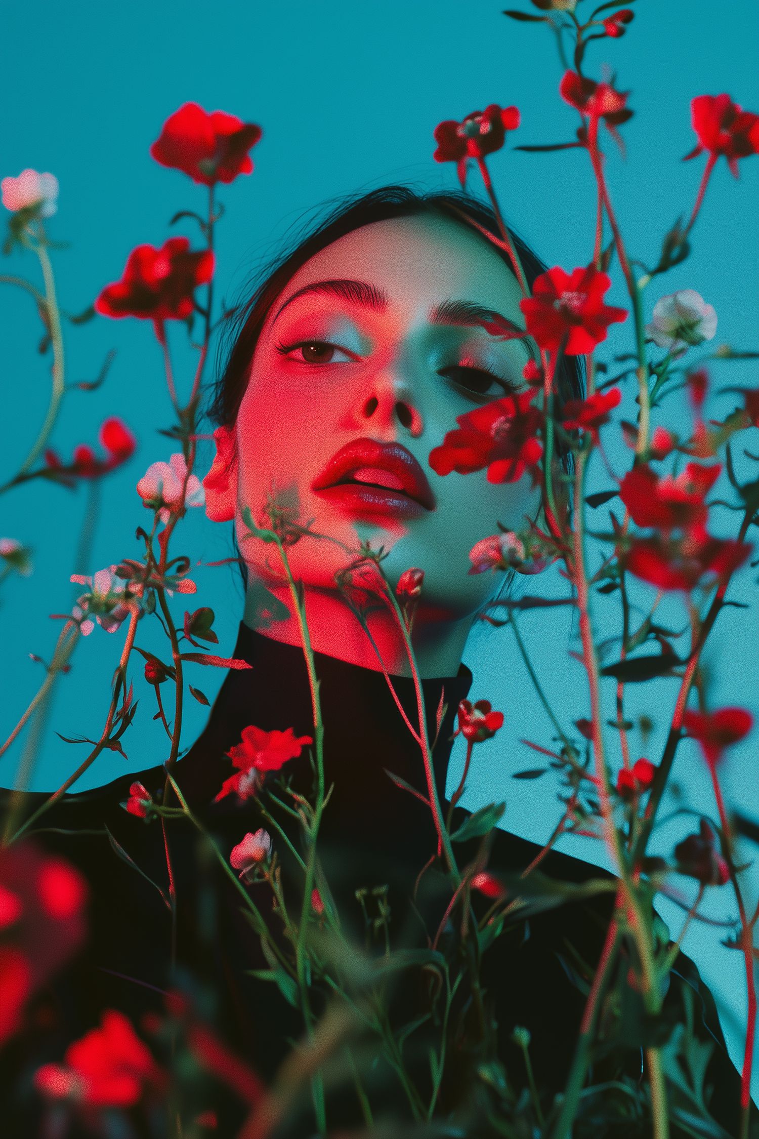 Bold portrait of a woman framed by red and white flowers, with dramatic red and teal lighting and a sleek black outfit.