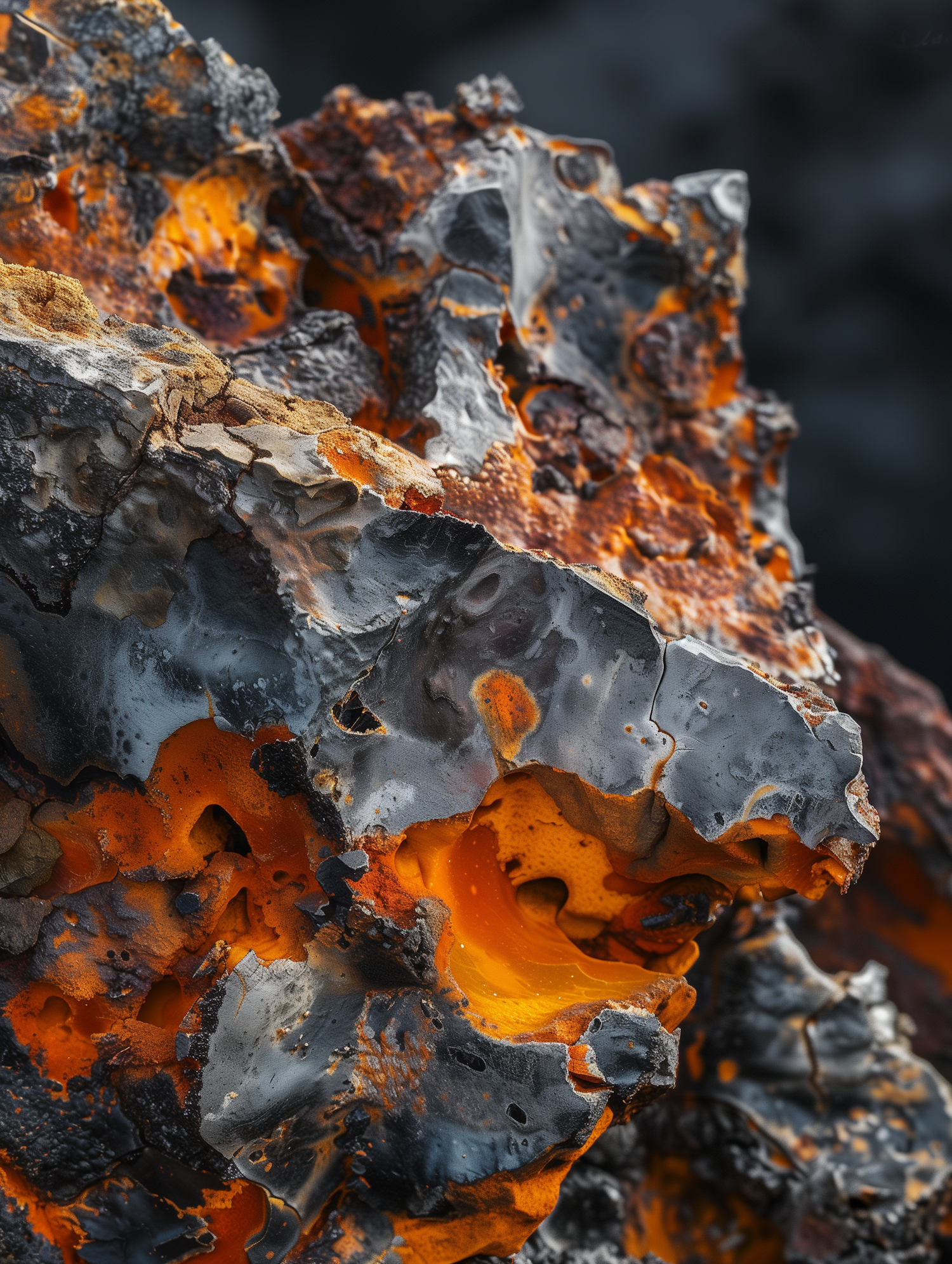 Close-up of a volcanic rock with vivid orange and black textures, resembling cooling lava with intricate cracks and molten layers.