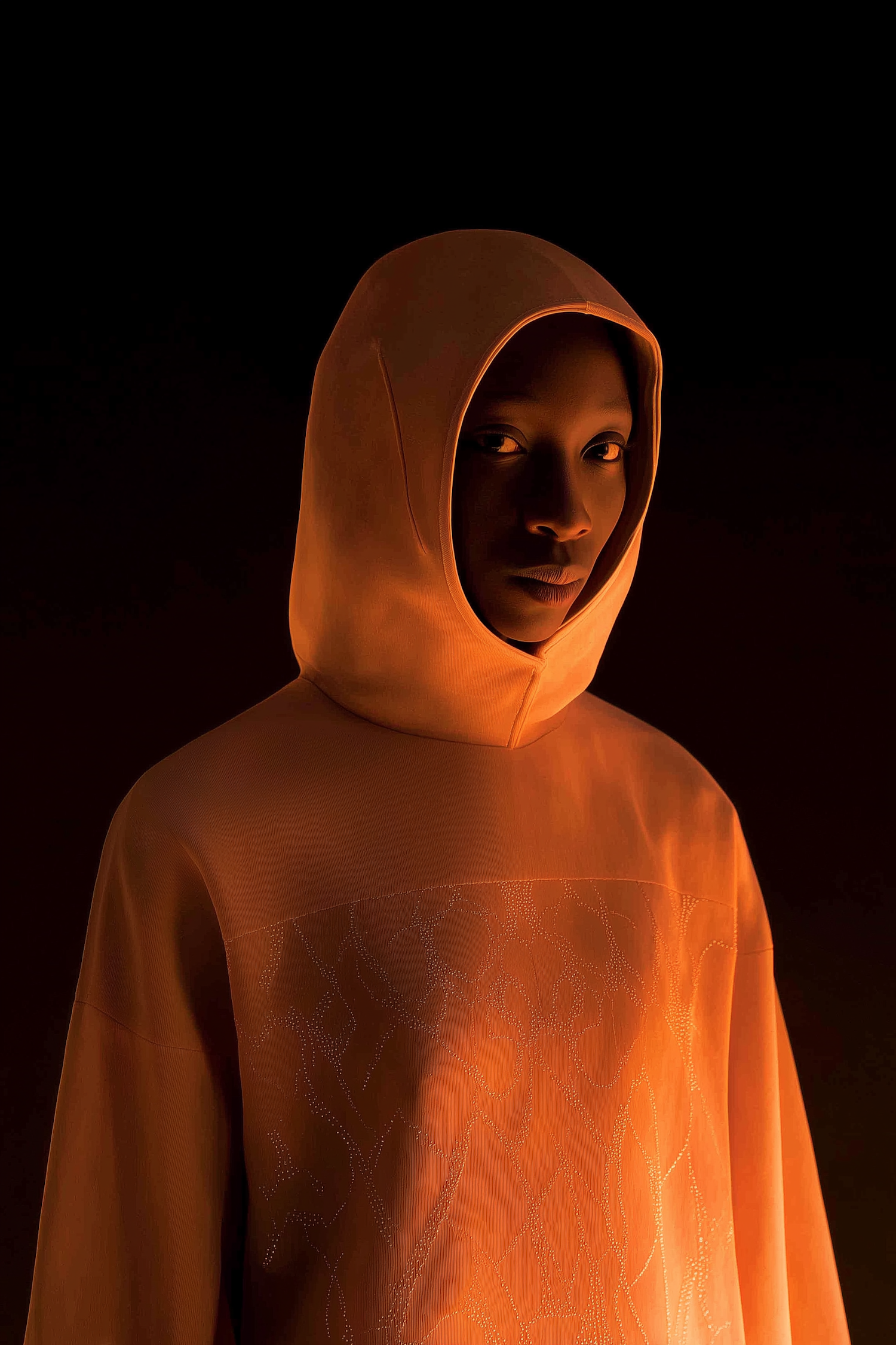 A striking portrait of a person in an orange hooded outfit, illuminated by warm light against a black background, creating a dramatic effect.