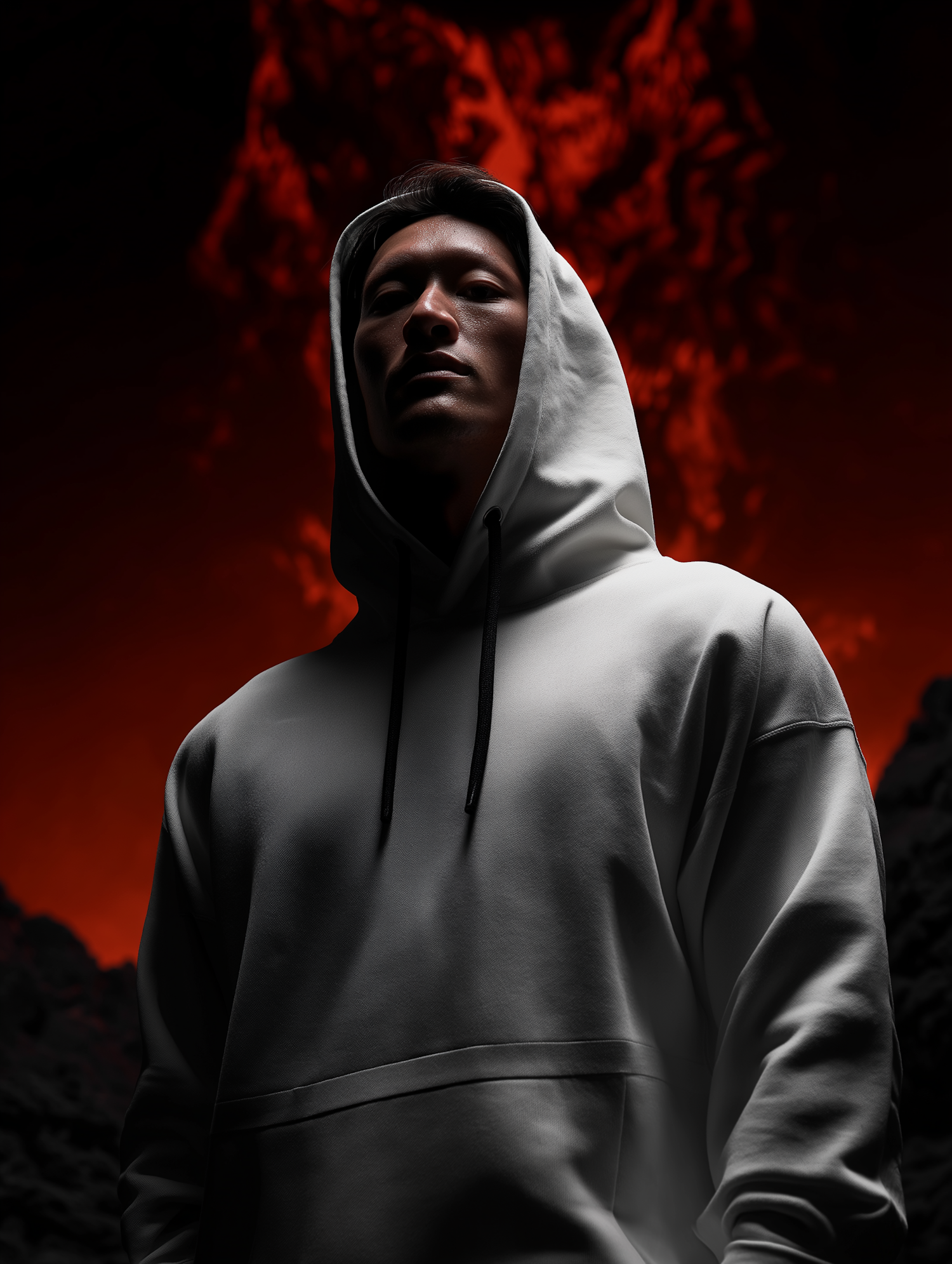 Man in white hoodie with fiery red background, dramatic lighting, and intense shadows creating a cinematic and mysterious vibe.