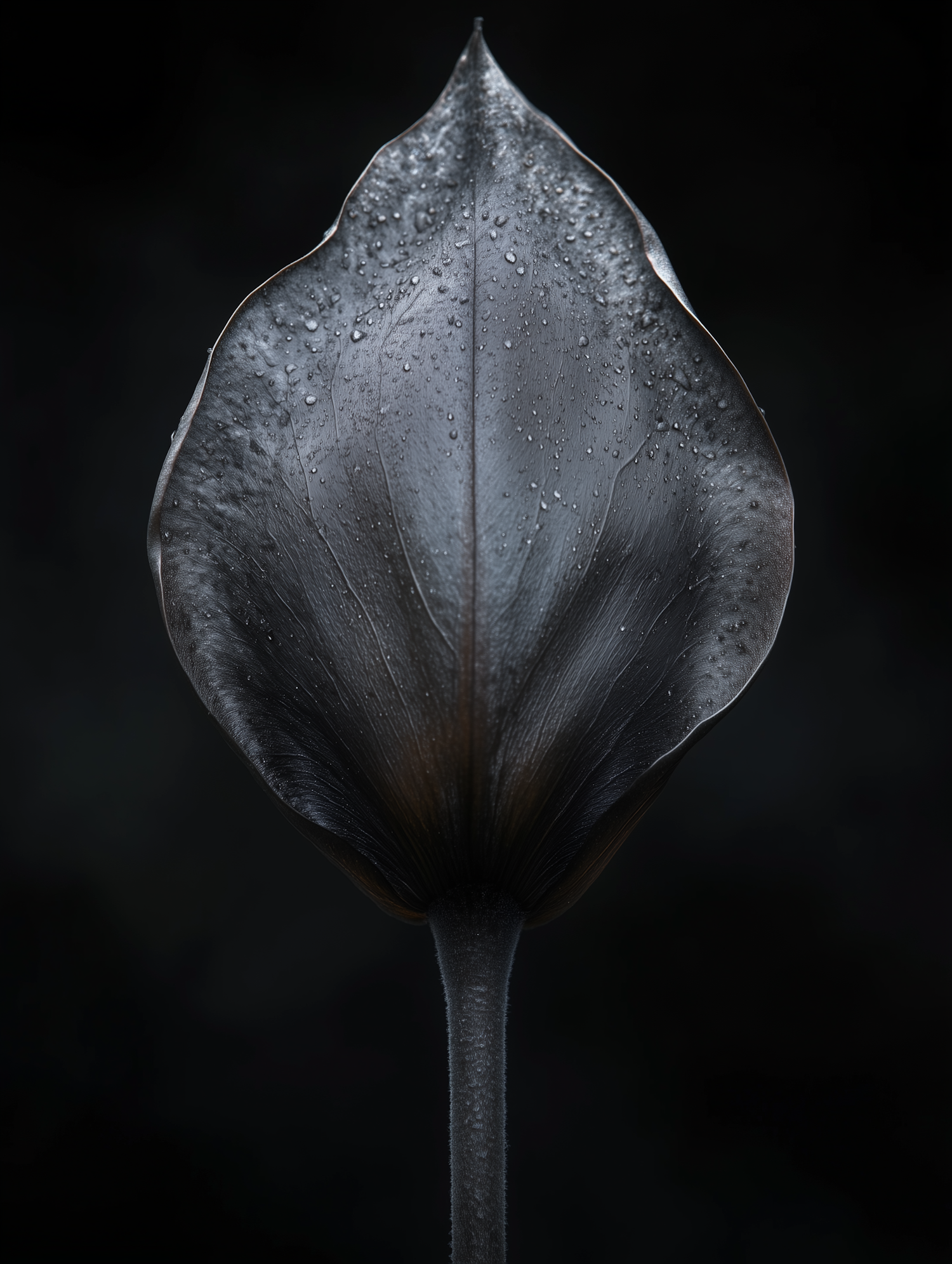 A dark tulip with water droplets on its petals against a black background, highlighting its glossy texture and elegant form.