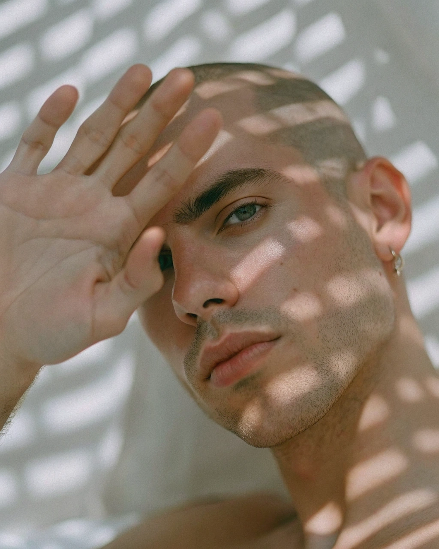 Close-up of a man with a shaved head, green eyes, and sunlight casting artistic shadows on his face. Neutral expression, hand raised.