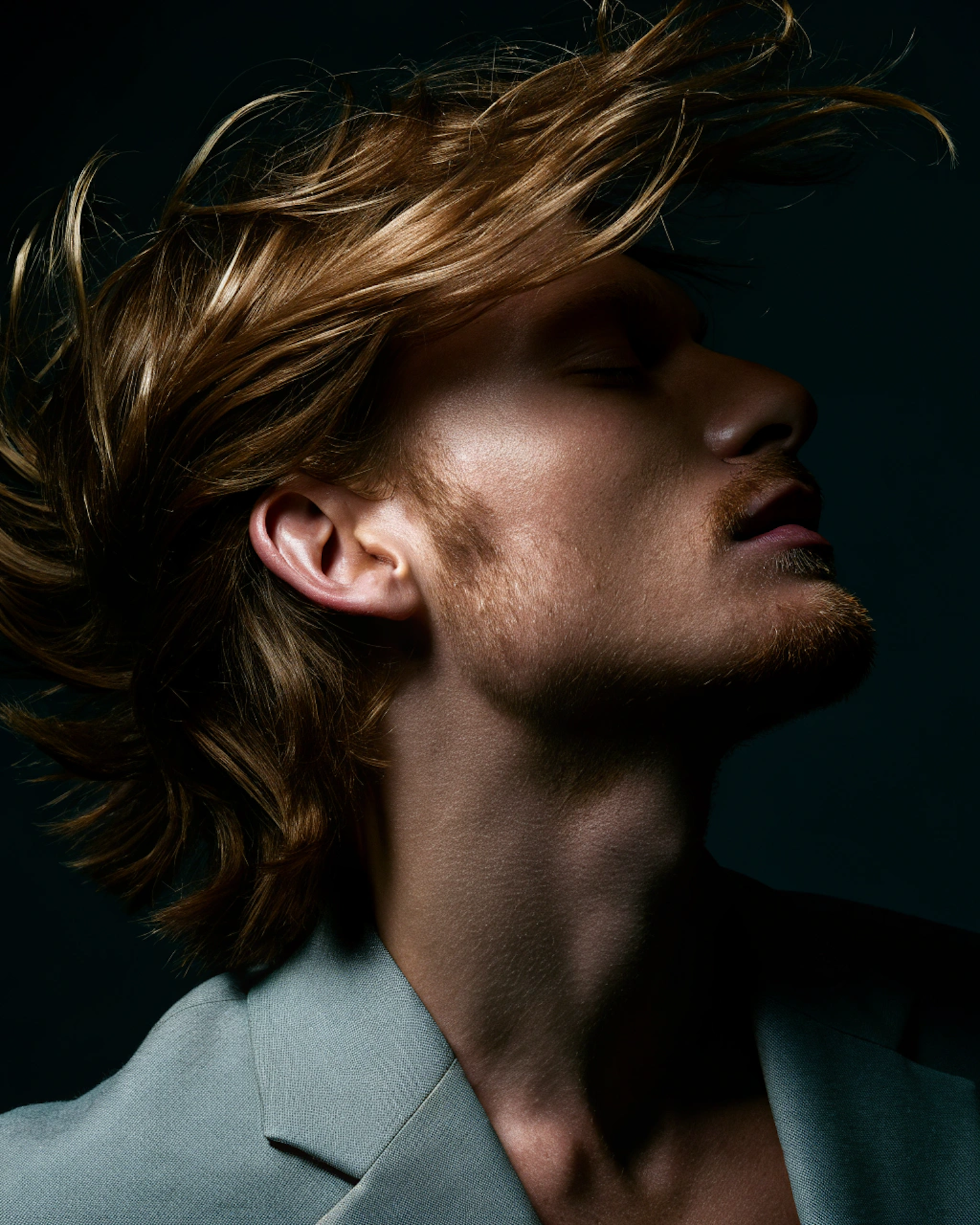 Dramatic close-up of a man with flowing light brown hair, closed eyes, and a light beard, set against a dark background.
