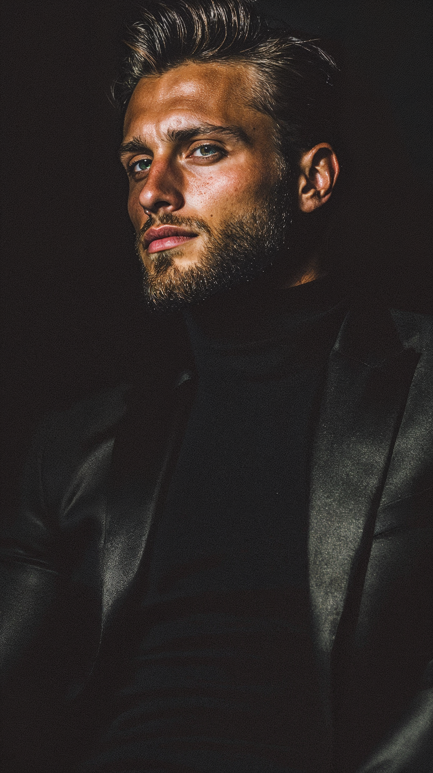 Close-up of a man with blue eyes, a beard, and styled hair in a black turtleneck and blazer, set against a dark background.