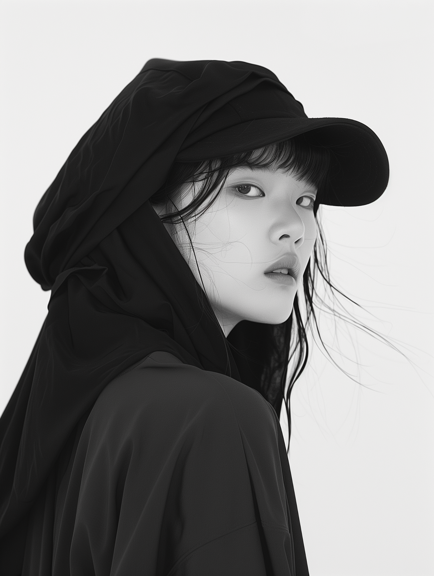 Monochrome portrait of a young Asian woman in a black cap and flowing garment, exuding elegance and mystery.