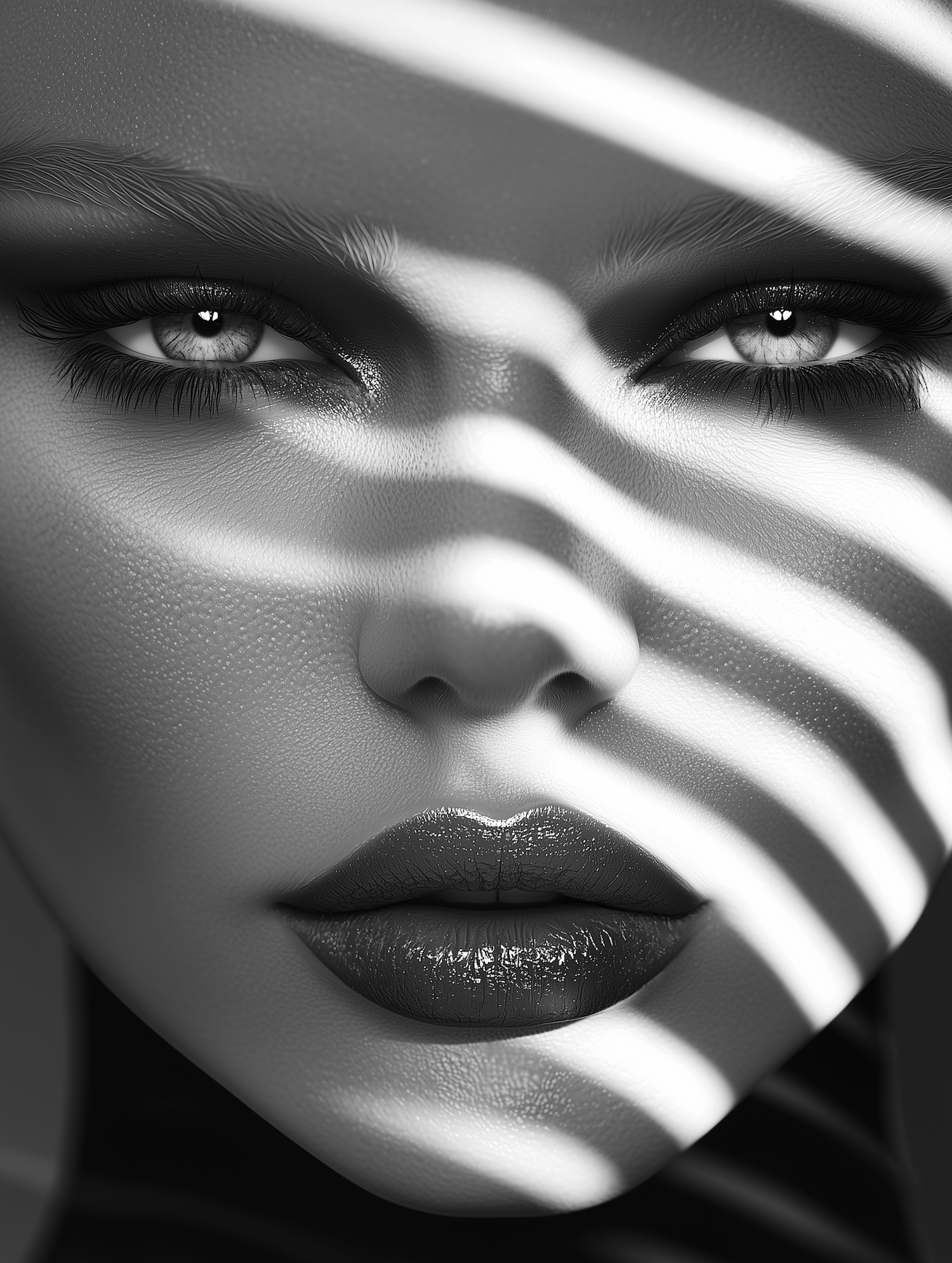 Black and white close-up portrait of a woman with dramatic lighting and expressive eyes, highlighting her glossy lips and textured skin.