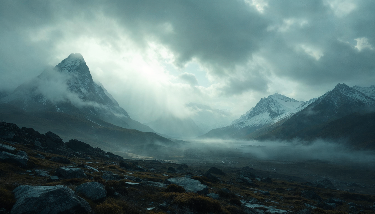 Majestic mountain landscape with misty peaks, dramatic clouds, and sunlight breaking through, creating a serene and ethereal atmosphere.