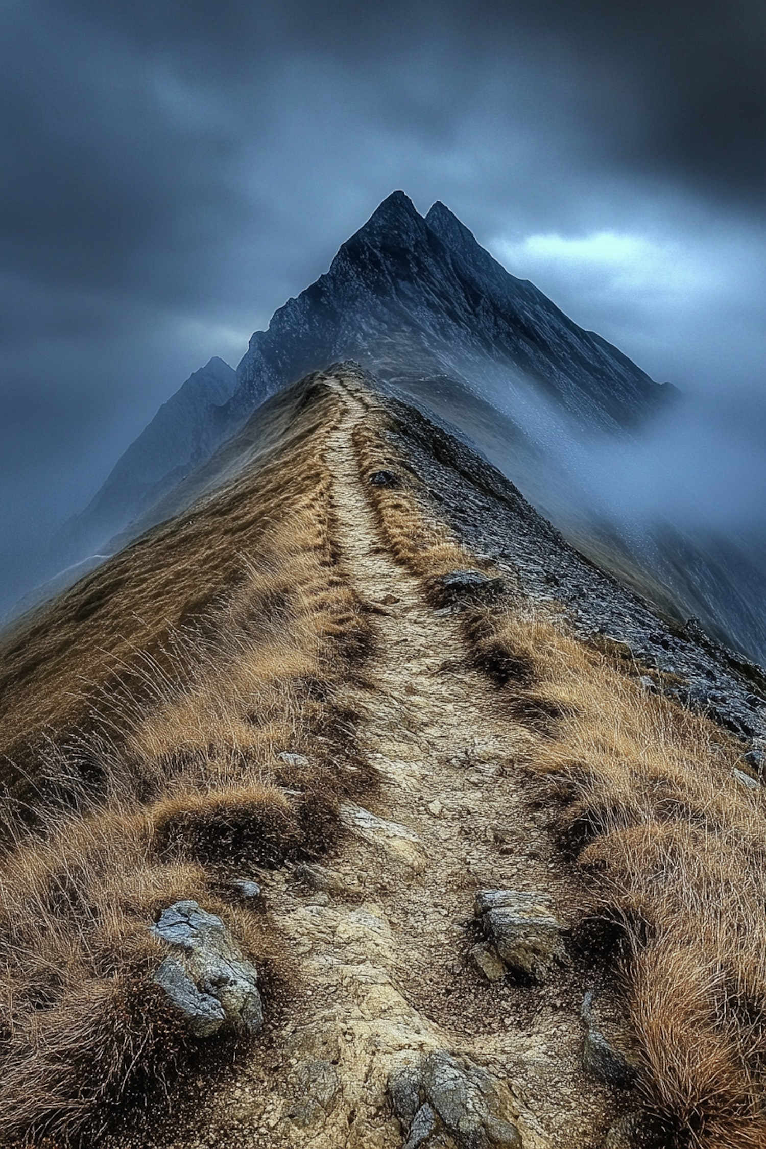 A dramatic mountain path leading to a misty peak, surrounded by dry grass and rocks under a moody sky.