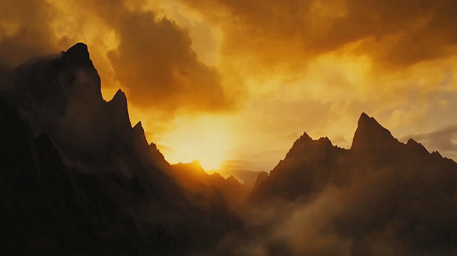 Dramatic mountain landscape at sunset with jagged peaks, golden clouds, and misty fog creating a mystical and awe-inspiring scene.