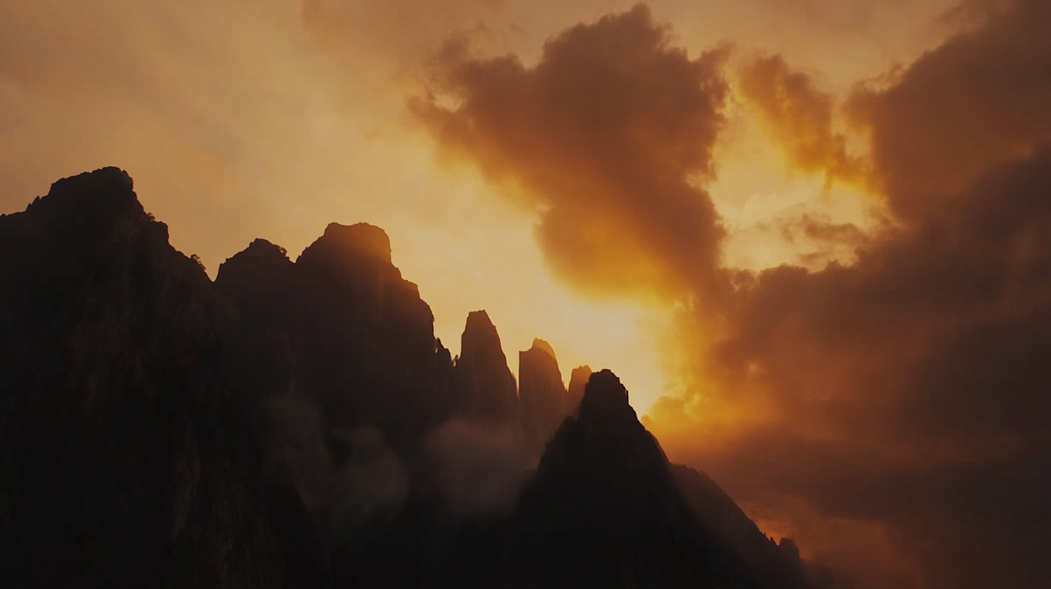 Dramatic mountain silhouette against a vibrant orange and yellow sky, with swirling clouds creating a mystical atmosphere.