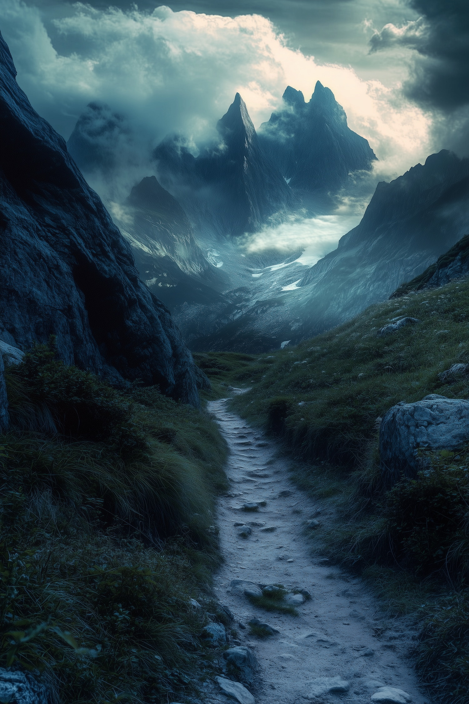 Mystical mountain path with jagged peaks and swirling clouds, creating a serene and dramatic landscape.