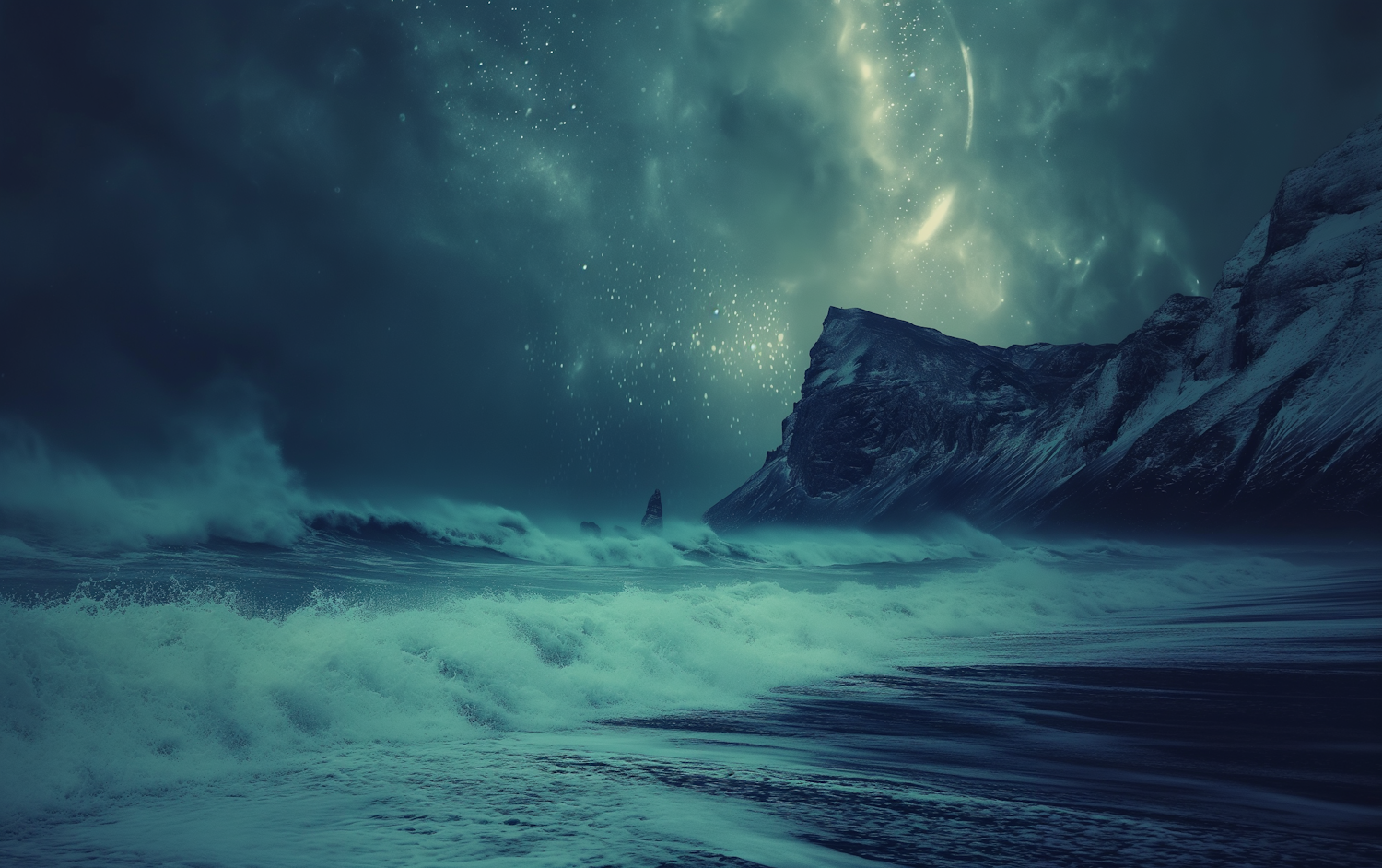 Mystical seascape with crashing waves, rugged cliffs, and a starry night sky. Deep blues and greens create an ethereal atmosphere.