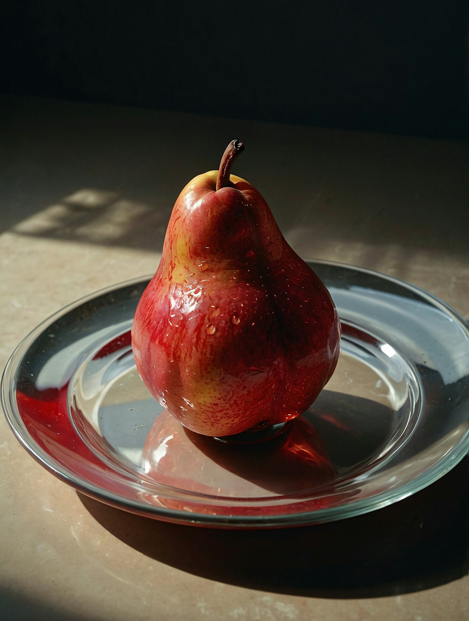 A ripe red pear with water droplets on a glass plate, beautifully lit with natural light against a dark background.