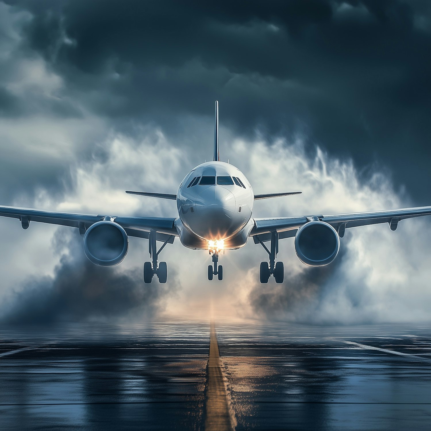 A dramatic shot of a commercial airplane taking off from a wet runway, surrounded by mist and stormy skies.