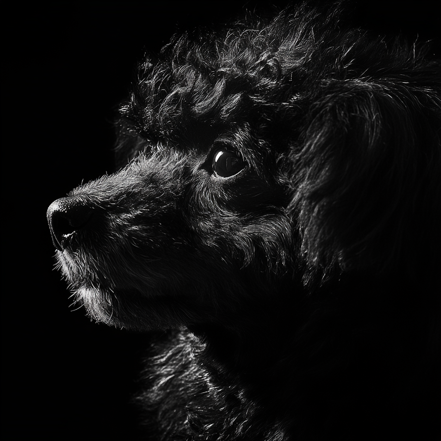 Black and white portrait of a curly-haired dog in profile, with dramatic lighting highlighting its fur texture.