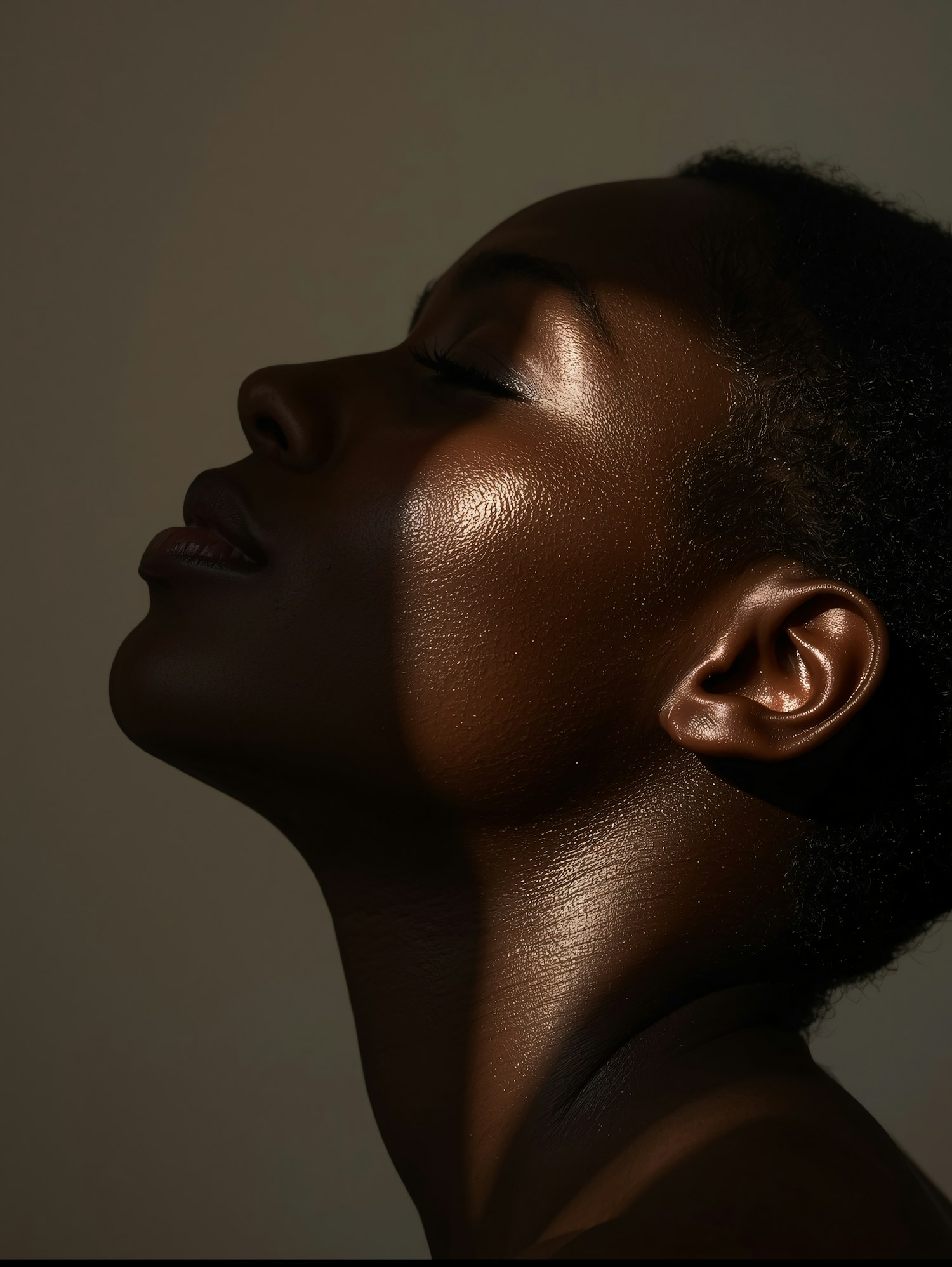 Close-up of a serene individual with glowing skin, highlighted by dramatic lighting and a neutral background.
