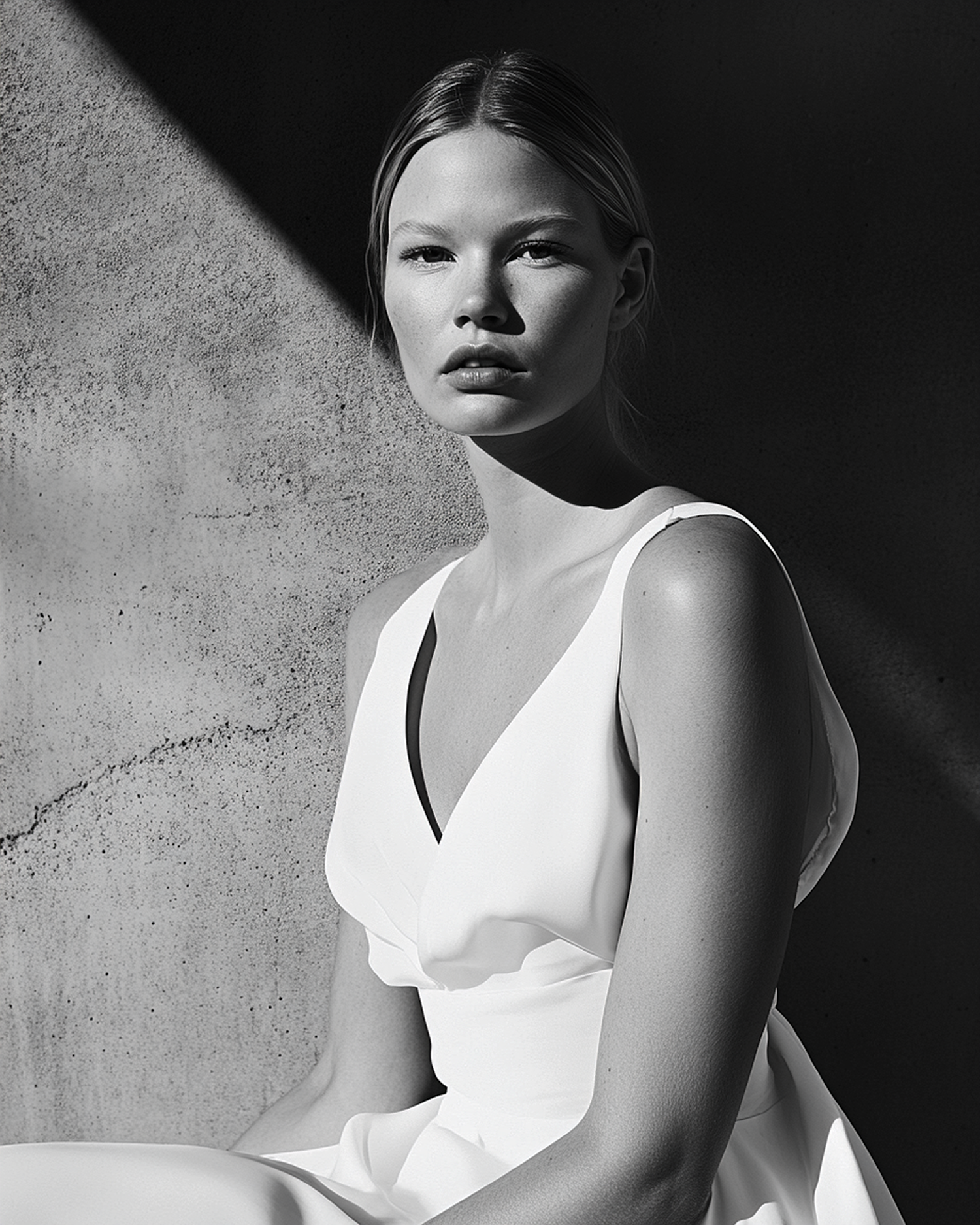 Striking black-and-white portrait of a woman in a white dress, with dramatic lighting and textured background for a bold visual impact.