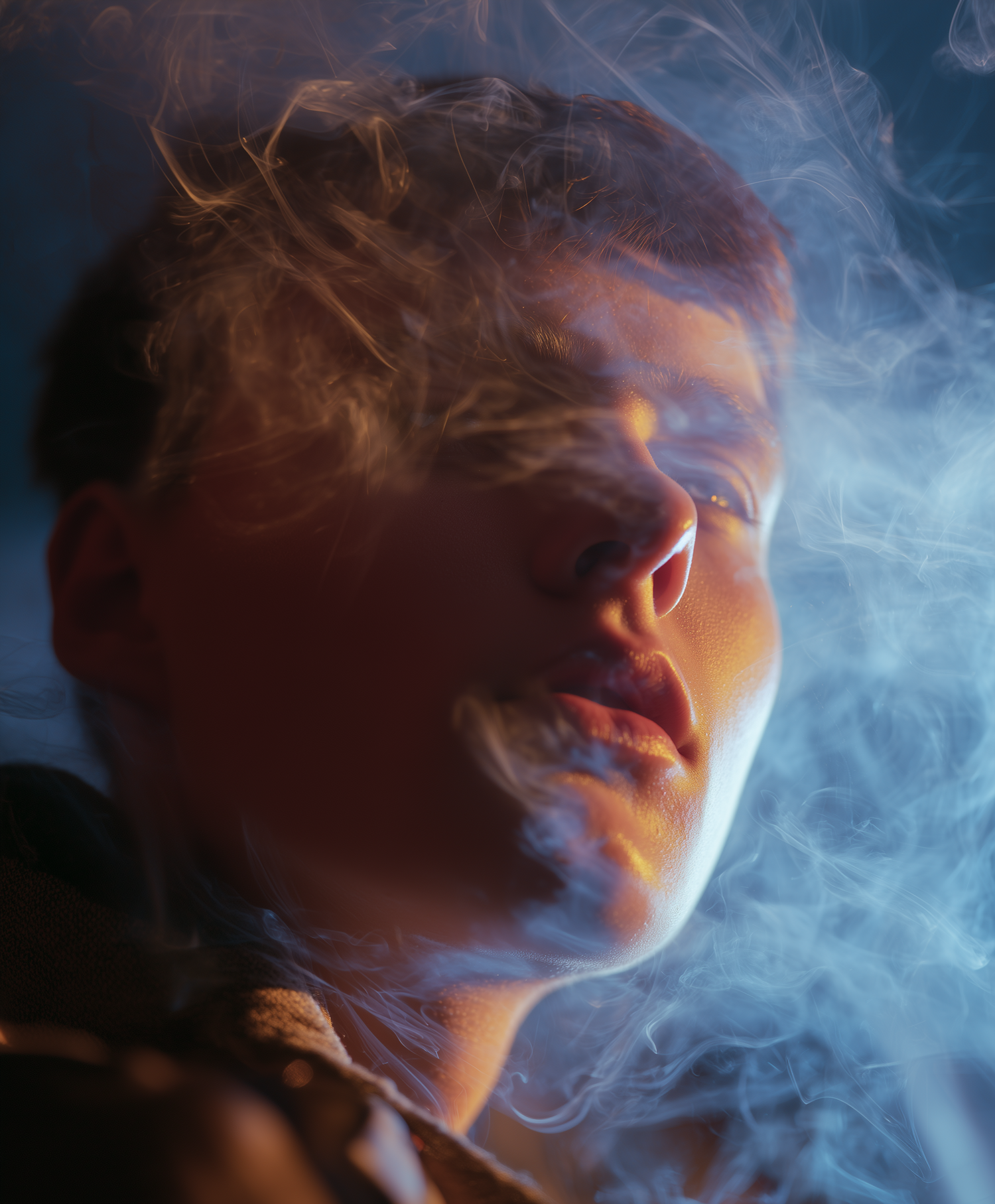 A dramatic close-up portrait with swirling smoke and contrasting warm and cool lighting, creating a mysterious and artistic atmosphere.