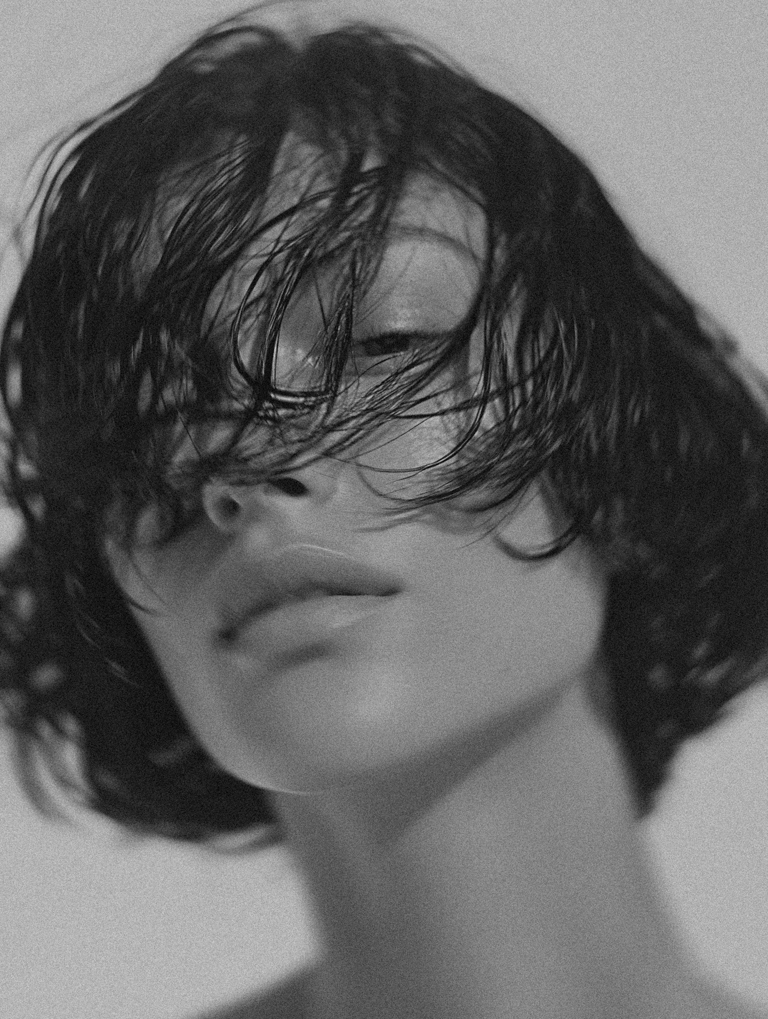 Artistic black-and-white portrait of a person with short, wet hair partially covering their face, creating a dramatic and moody effect.