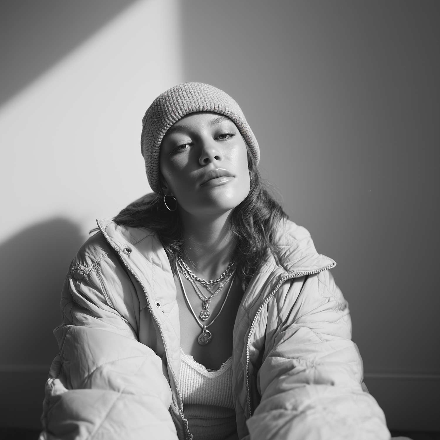 Stylish black-and-white portrait of a person in a beanie and puffy jacket, showcasing layered necklaces and a confident expression.