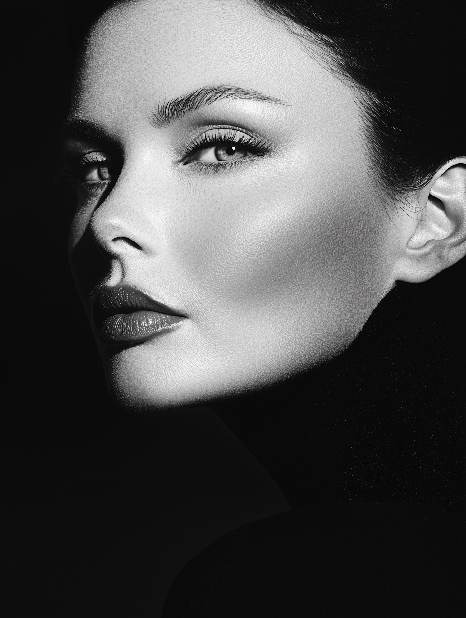 Elegant black and white portrait of a woman with striking features and dramatic lighting, highlighting her eyes and lips.