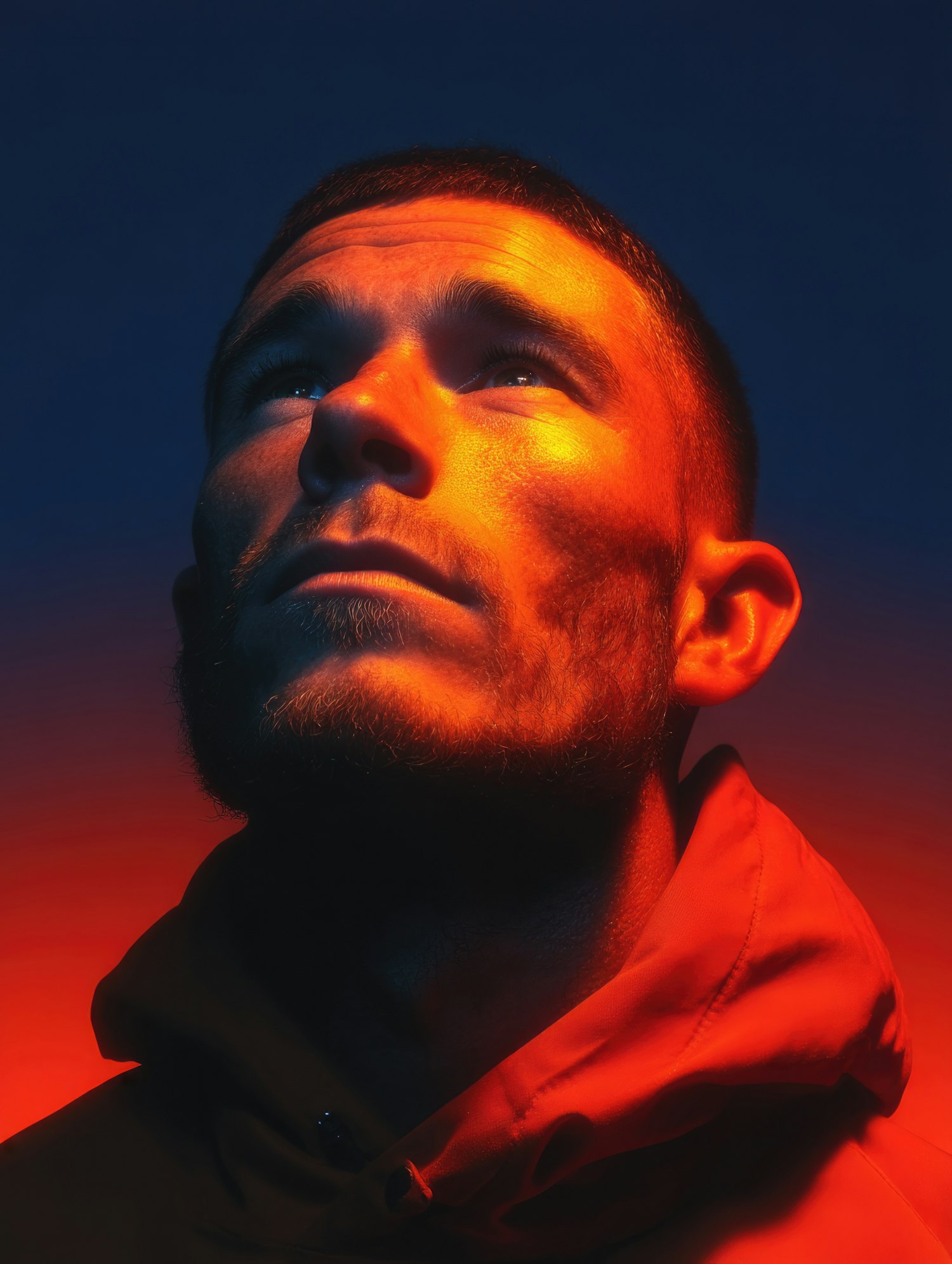 Portrait of a man with striking orange and blue lighting, dramatic tones highlighting strong shadows and warm gradient hues.