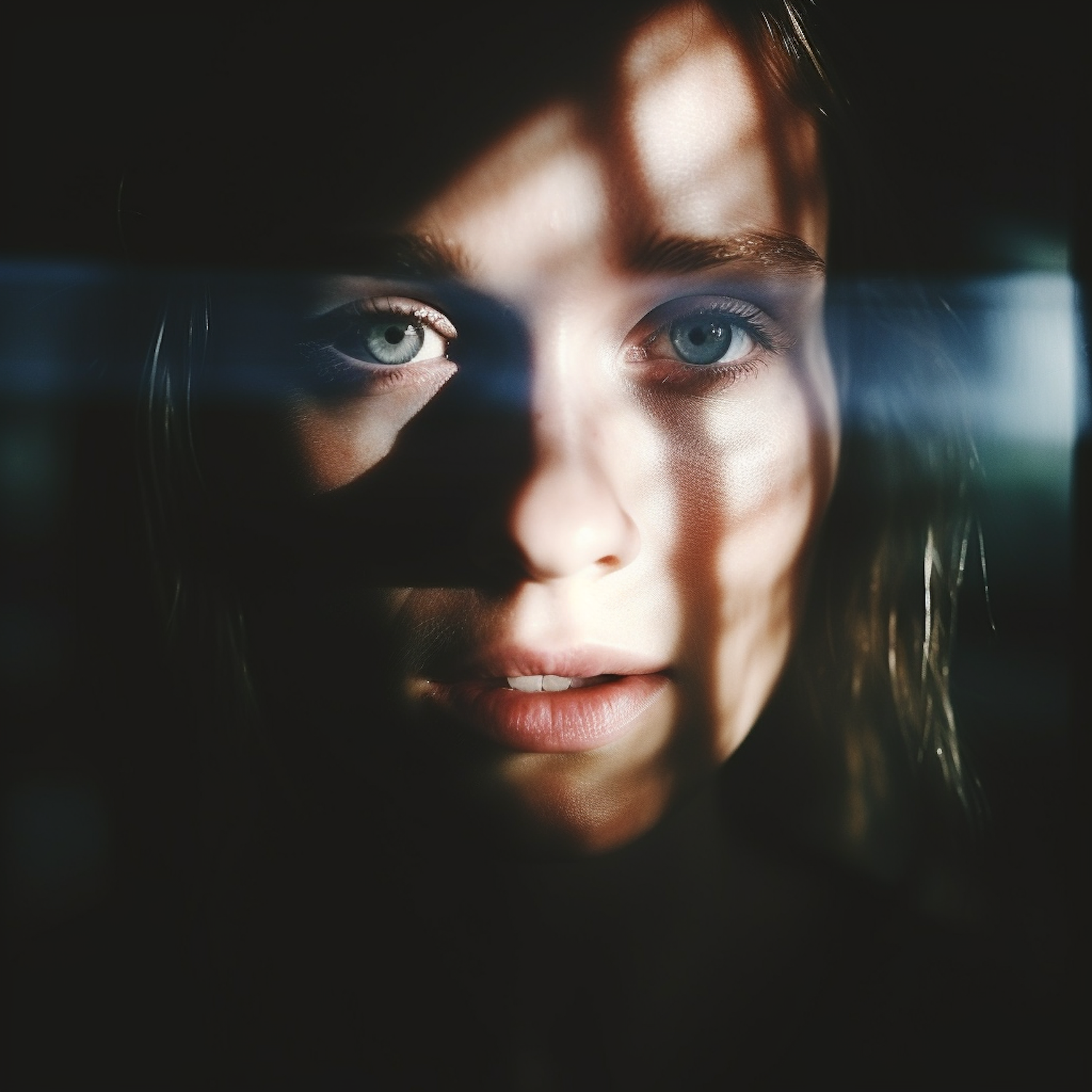 Close-up portrait of a woman with light blue eyes, illuminated by dappled light, creating a dramatic shadow pattern on her face.