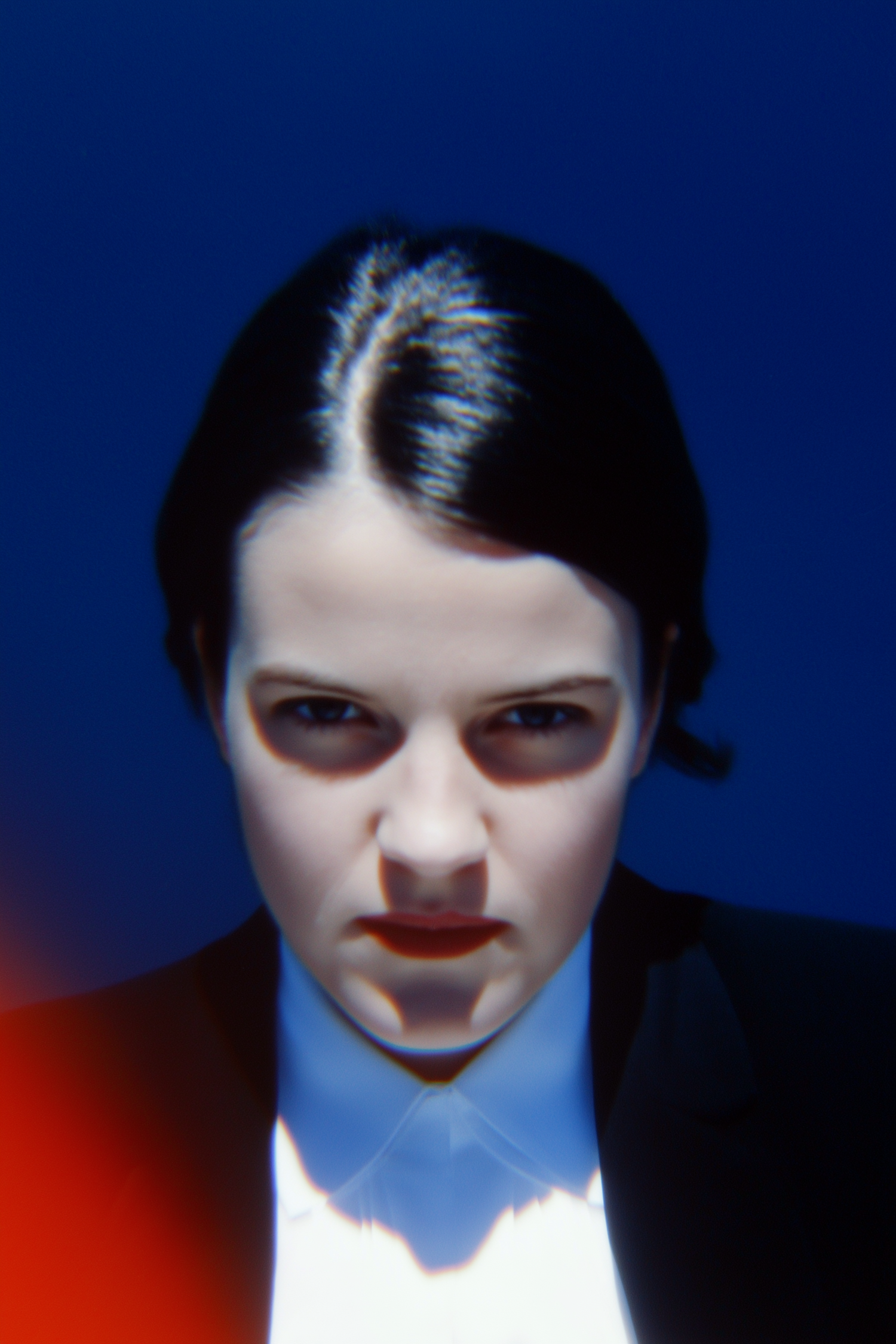 Close-up portrait of a person in formal attire with intense expression, set against a deep blue background with dramatic lighting.