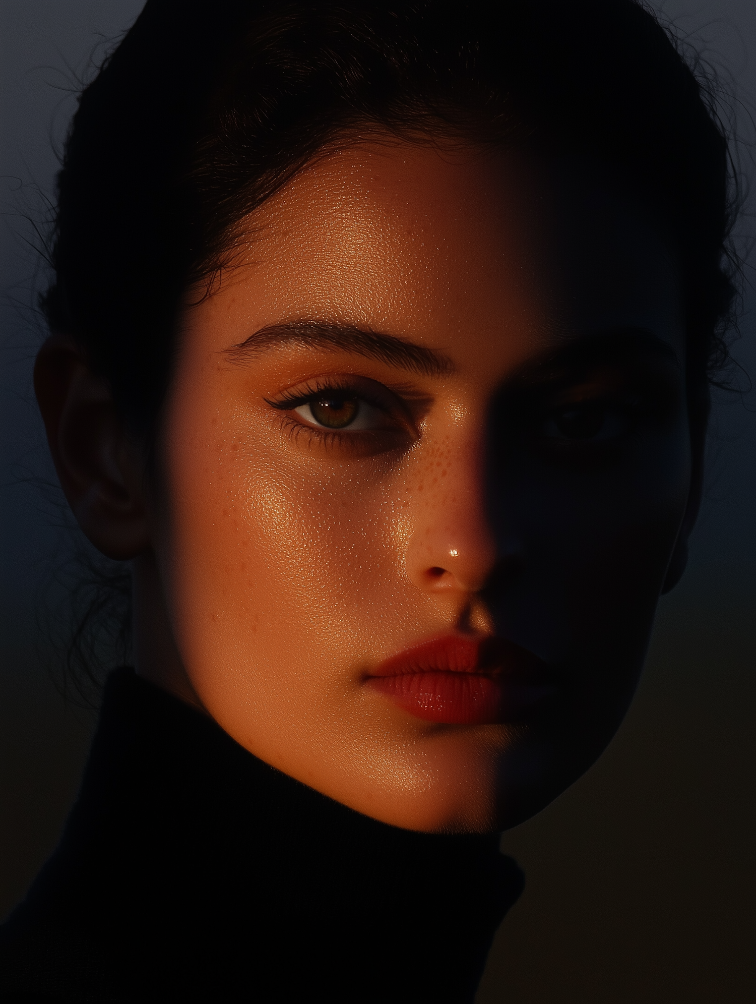 Dramatic portrait of a woman with bold red lips and striking light-shadow contrast on her face.