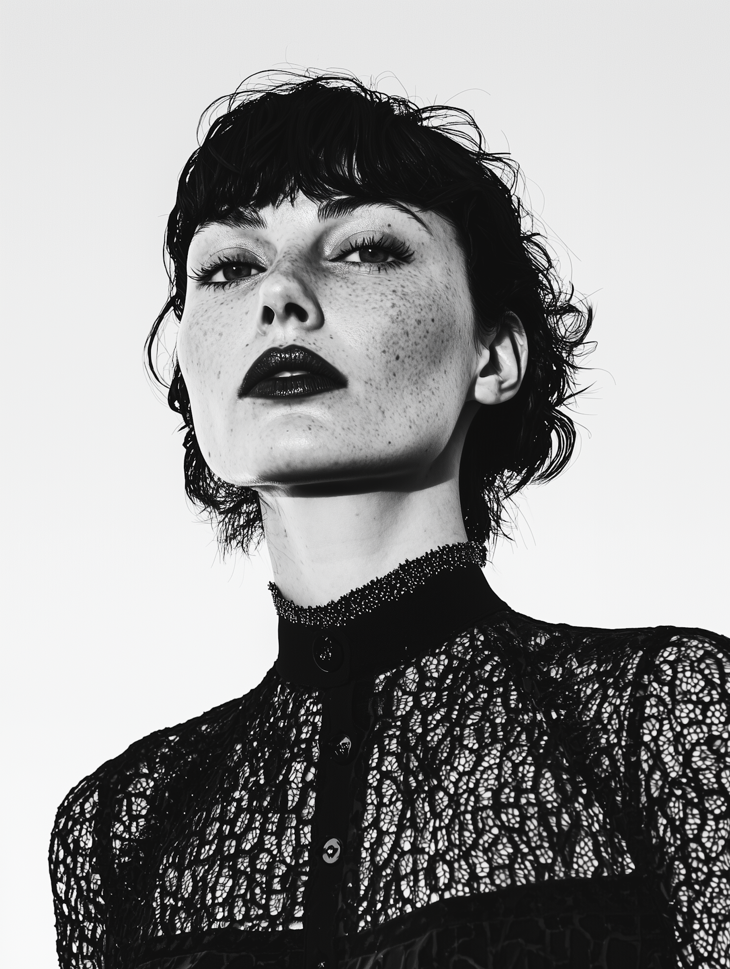 Striking black-and-white portrait of a freckled woman in lace, with bold makeup and a confident gaze. Perfect for fashion or editorial themes.
