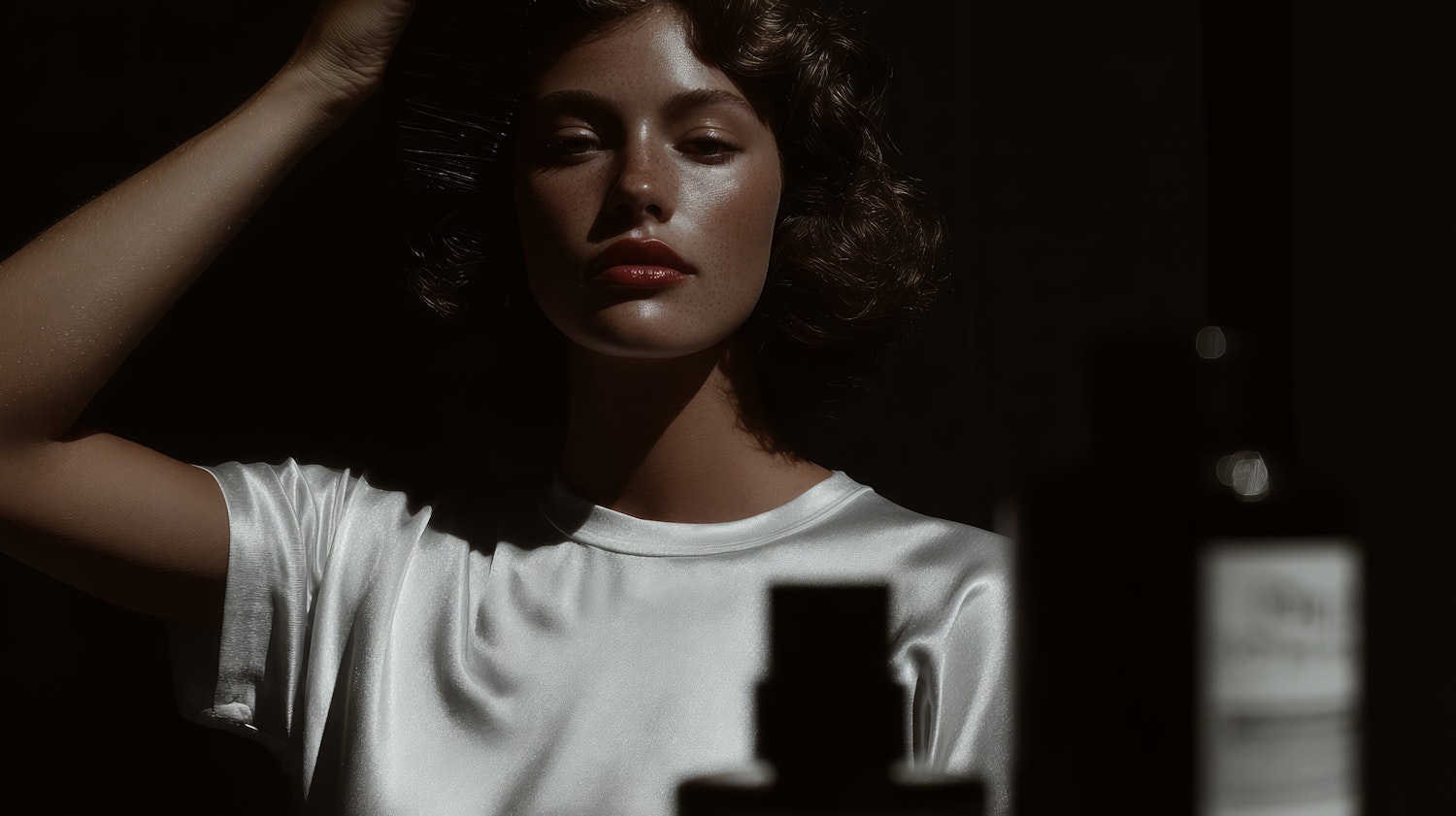 A woman in a white satin blouse is dramatically lit against a dark background, with blurred objects in the foreground adding depth.