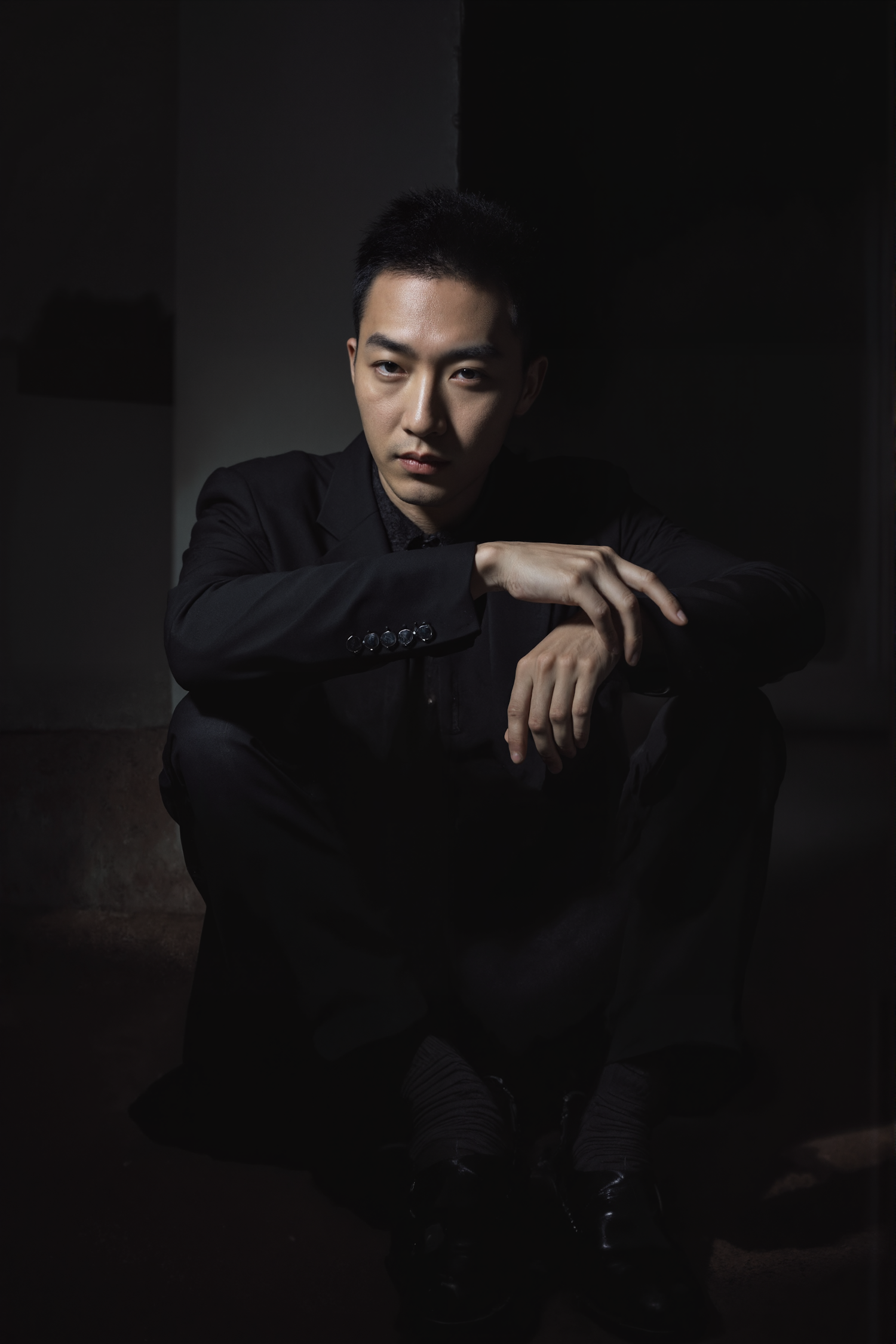 A man in a black suit sits in dramatic lighting, exuding a serious and contemplative vibe in a dark, minimalistic setting.