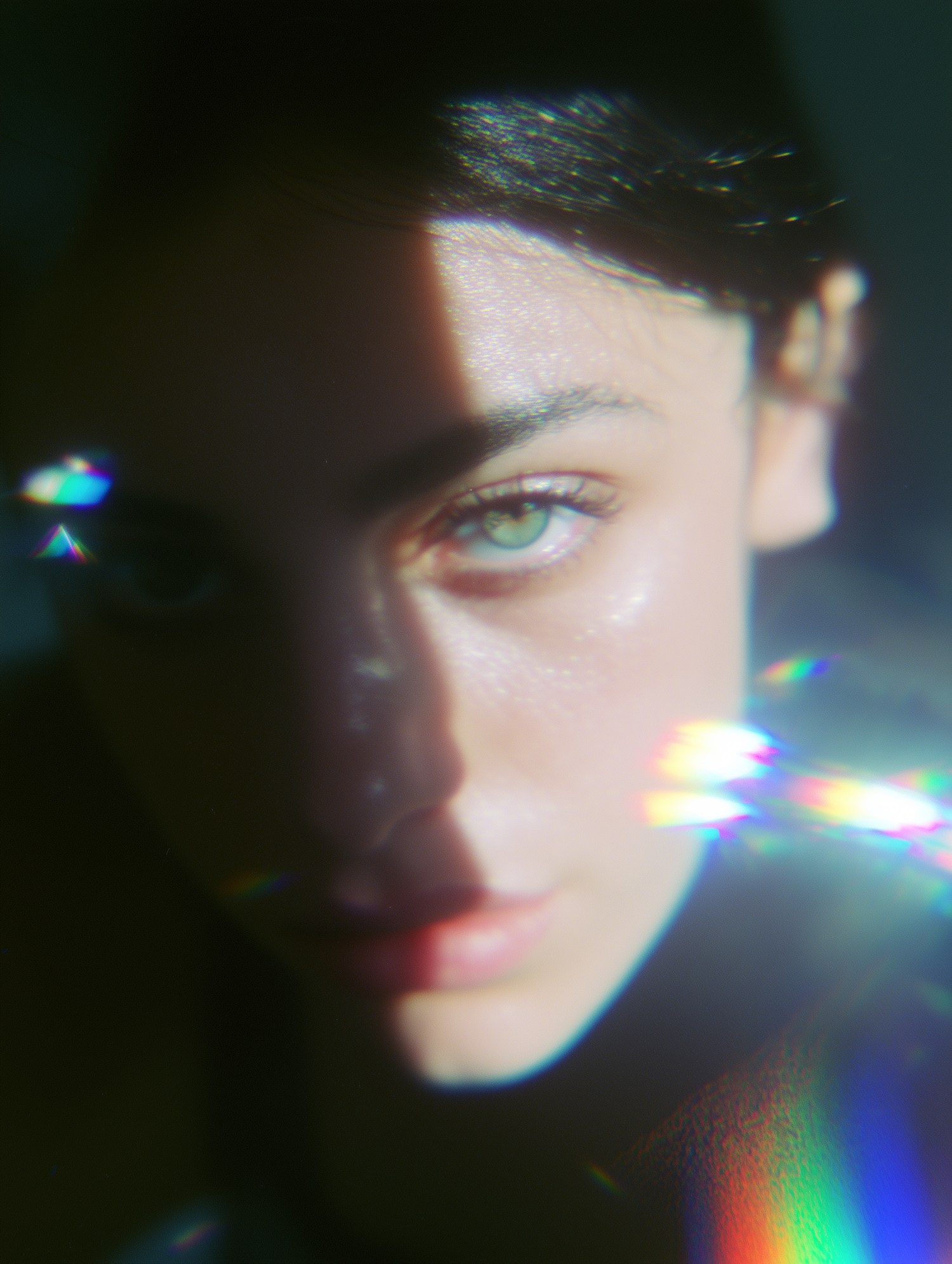 Close-up of a person with green eyes, soft lighting, and rainbow reflections creating a dreamy, ethereal vibe.