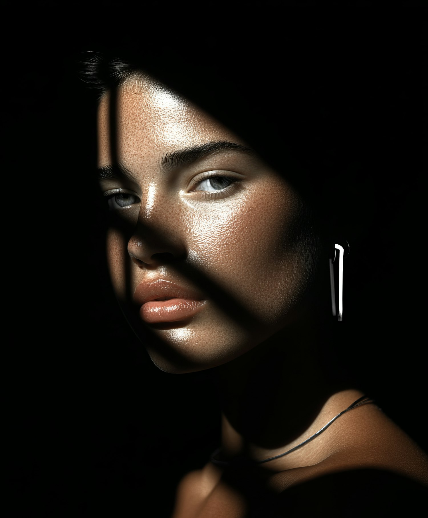 A dramatic close-up portrait with striking lighting, highlighting the subject's features against a dark background.