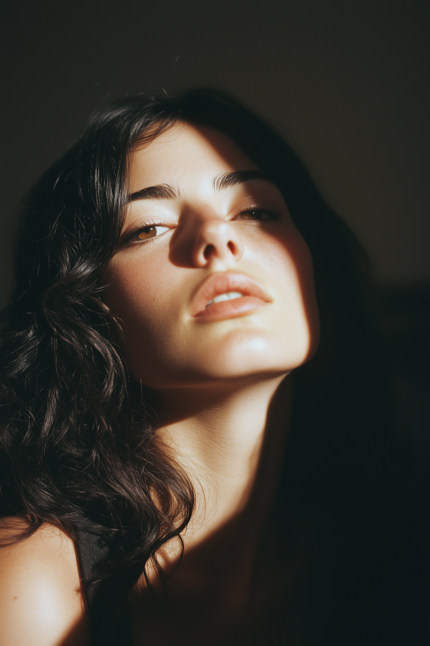 Close-up portrait of a young woman with dark hair, soft lighting, and dramatic shadows, creating an intimate and serene mood.