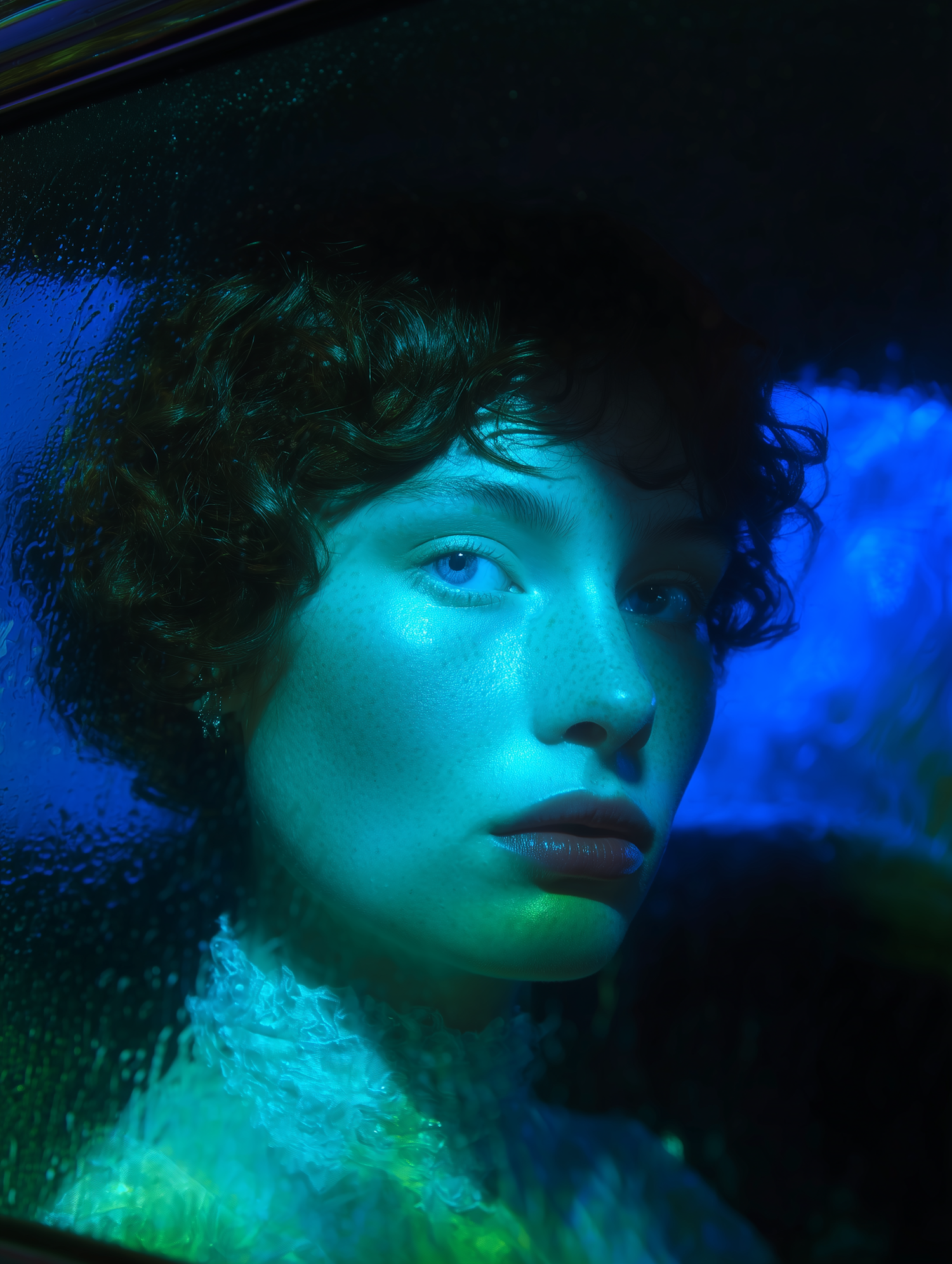 Artistic portrait of a person with curly hair, illuminated by blue and green light, framed by a textured, wet surface for a dramatic effect.