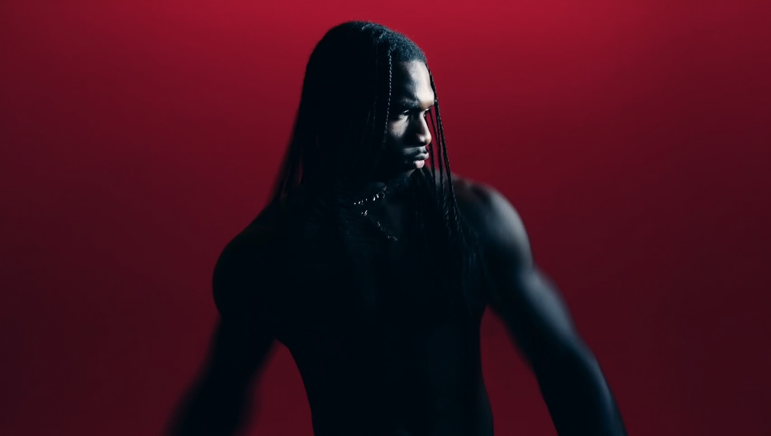 A striking portrait of a person with braided hair against a vivid red background, showcasing dramatic lighting and a dynamic pose.