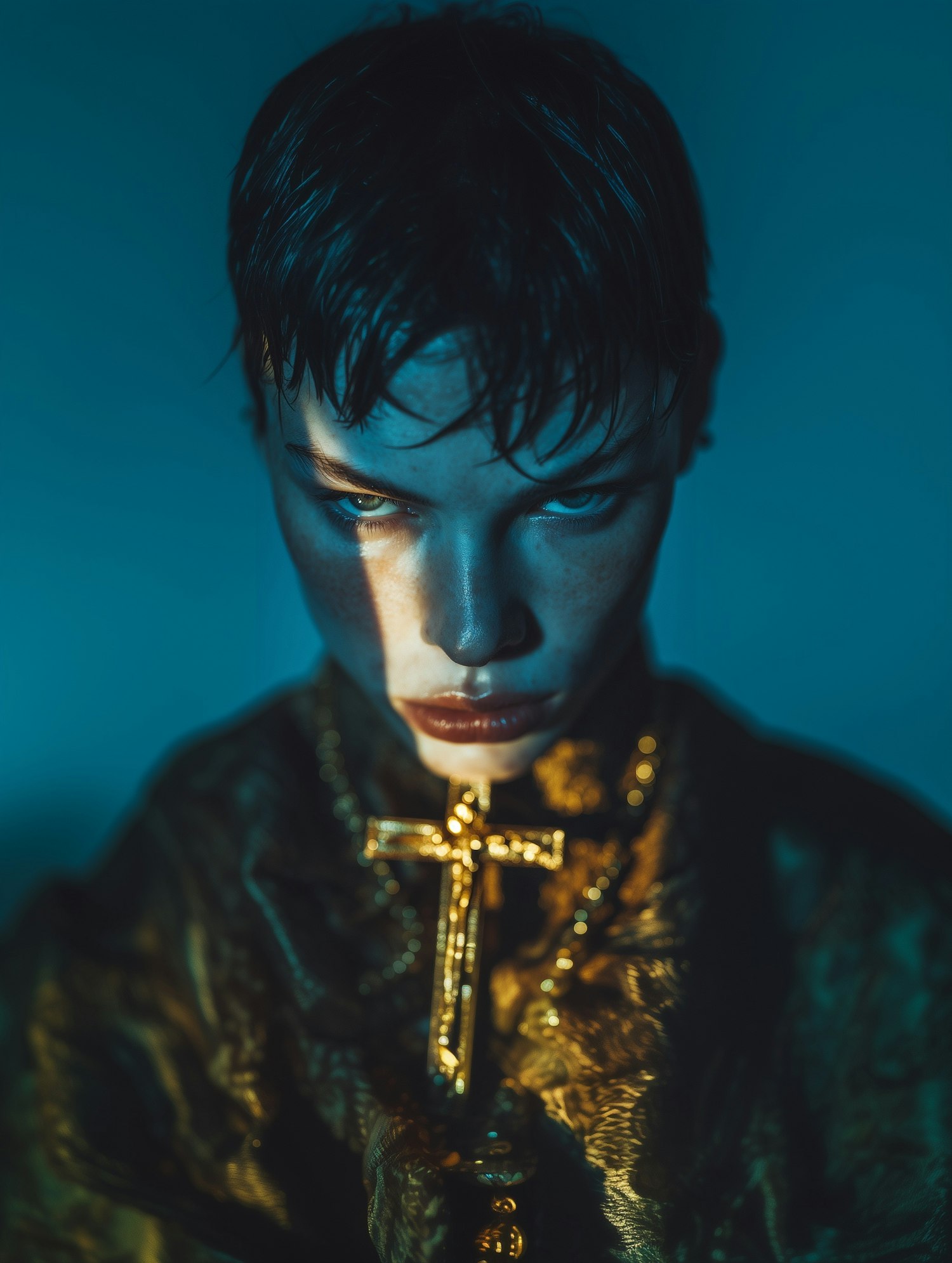 A dramatic portrait of a person with intense lighting, a golden cross necklace, and a moody blue background, creating a striking visual impact.