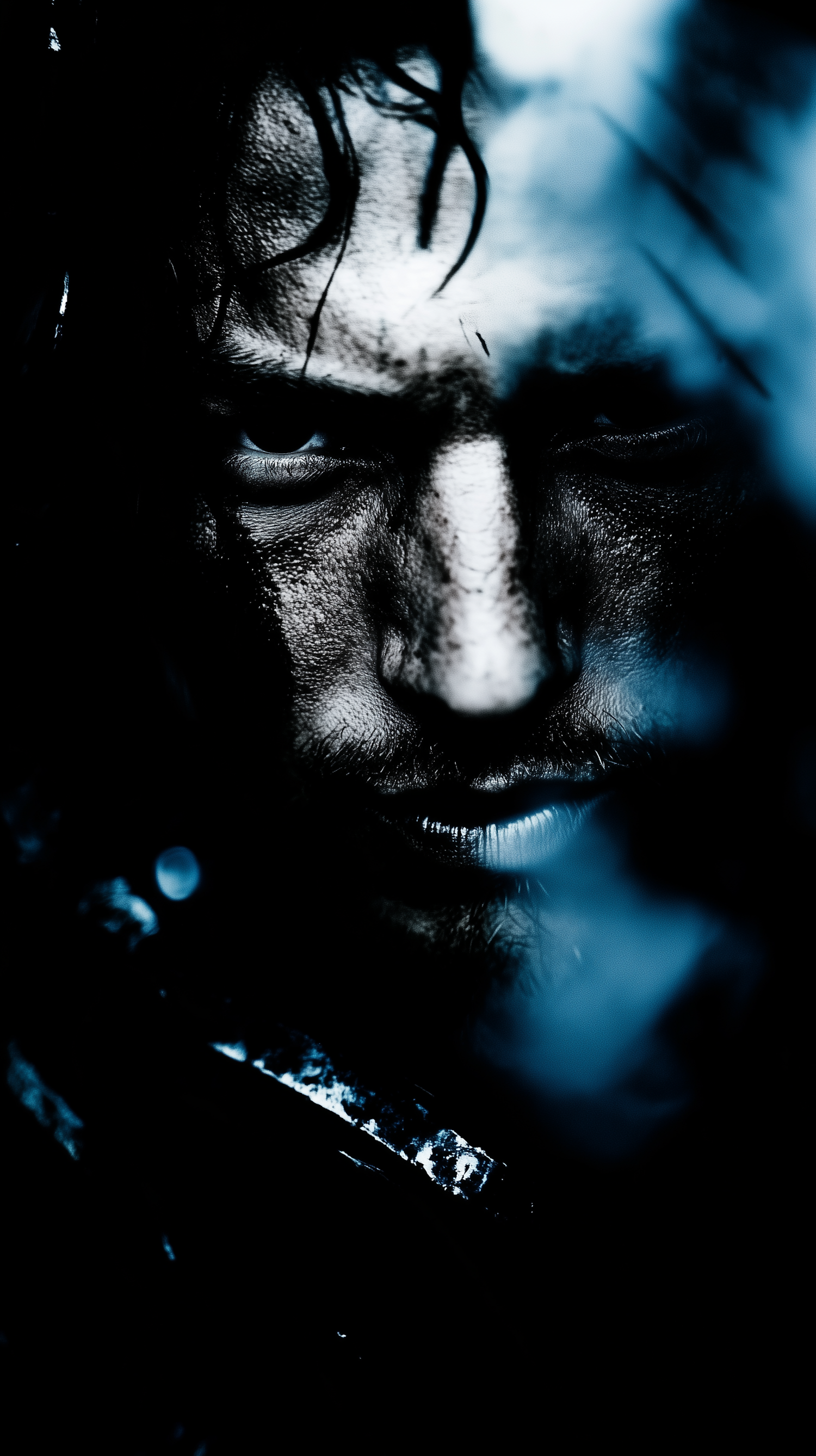 Intense close-up of a rugged man with piercing eyes, wet hair, and dramatic blue lighting creating a mysterious, cinematic vibe.