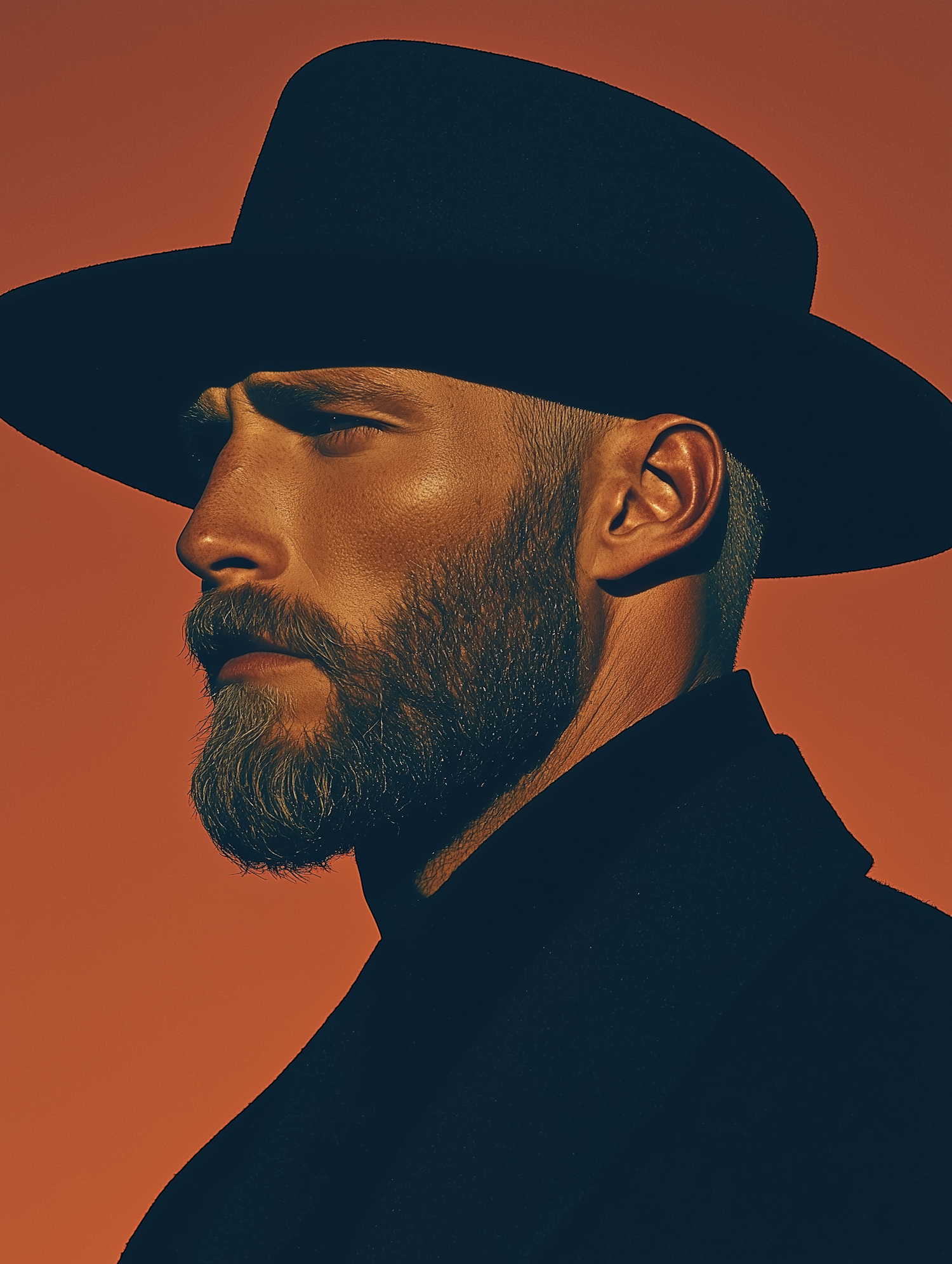 Profile of a bearded man in a wide-brimmed hat against an orange background, exuding a mysterious and cinematic vibe.