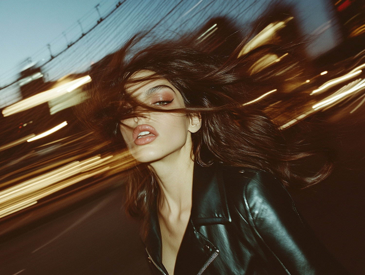 Dynamic portrait of a woman with flowing hair and city lights, capturing motion and energy in a stylish urban setting.